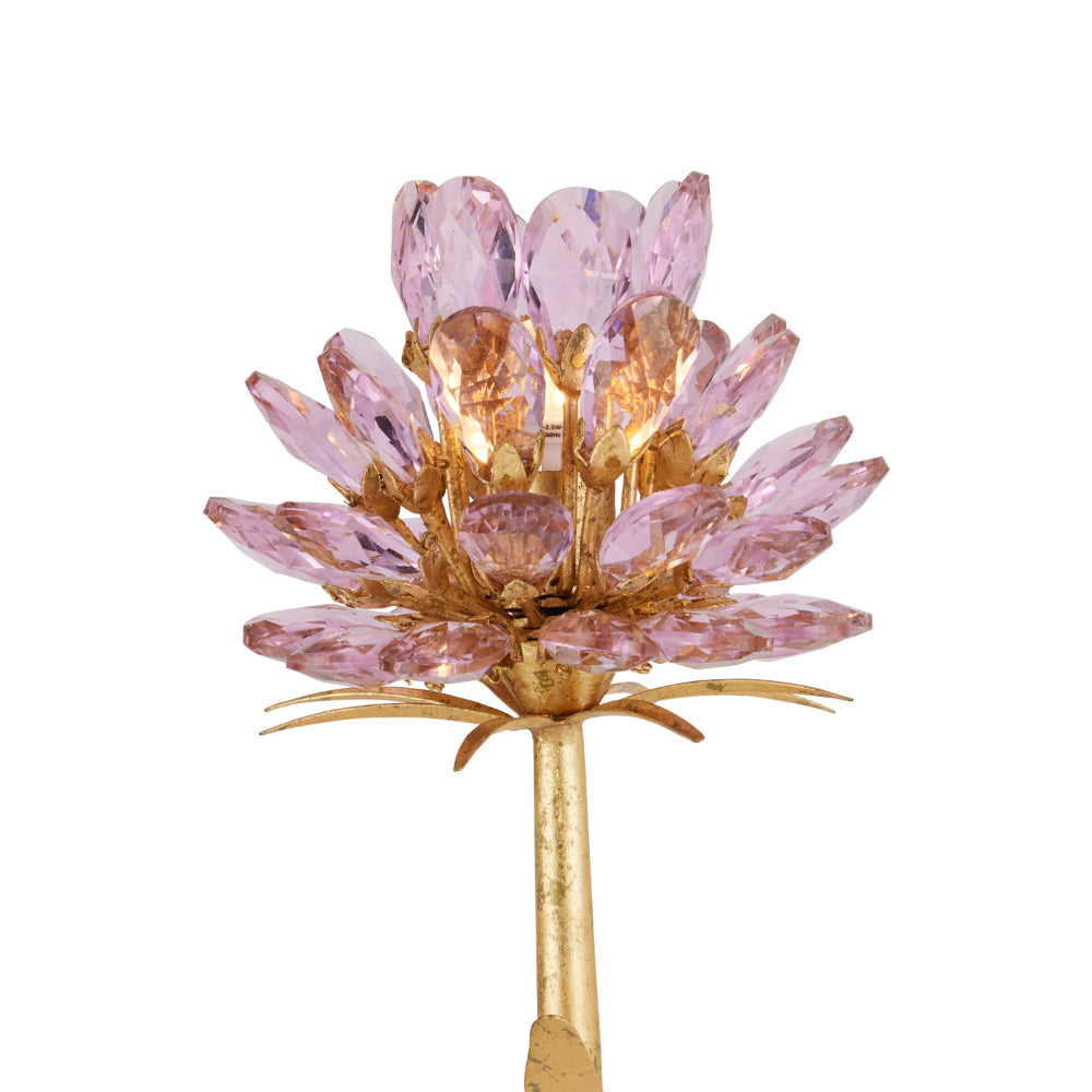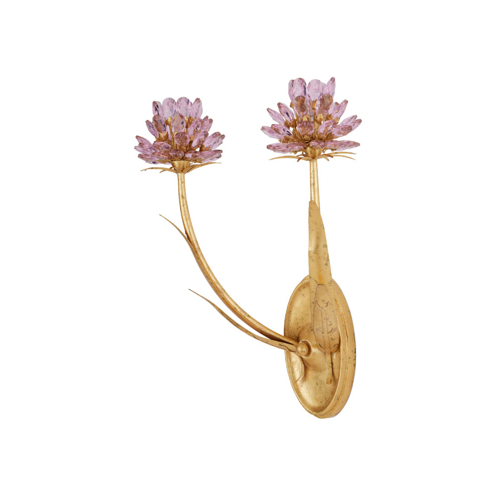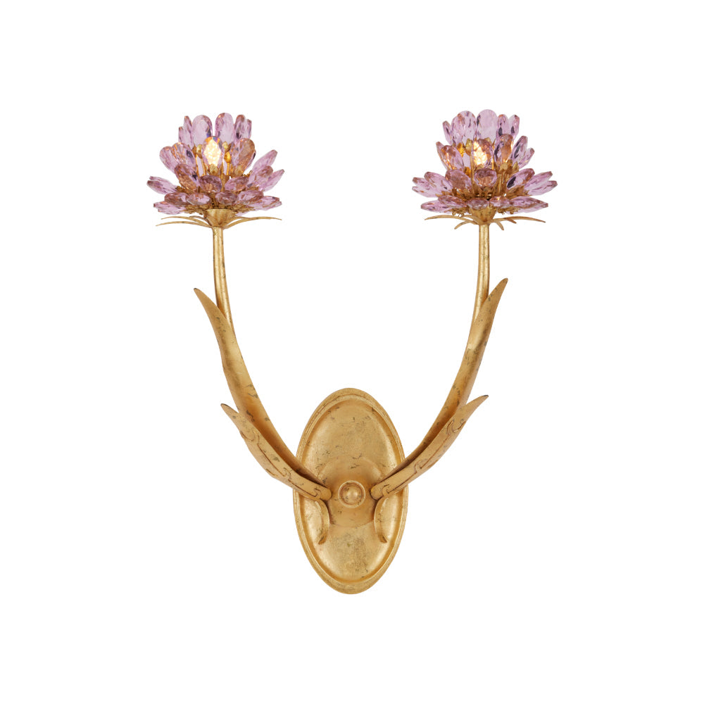 The Marilee Double-Light Wall Sconce is a luminous blend of elegance and whimsy. Finished in radiant Dutch Gold Leaf, its graceful metal stems curve upward, blooming with faceted pink crystal blossoms that catch and reflect the light. Each bulb is nestled within the sparkling glass, enhancing the natural shimmer of the crystals and creating a soft, effervescent glow.