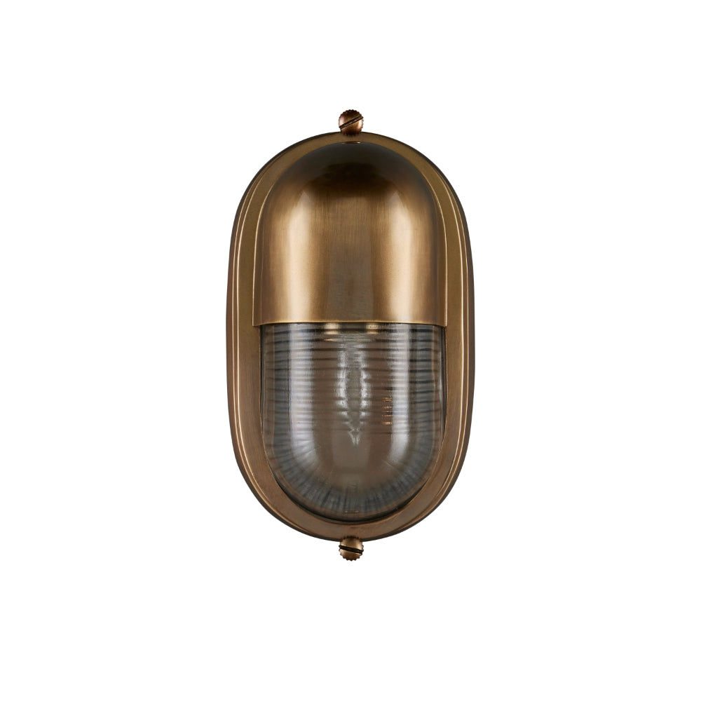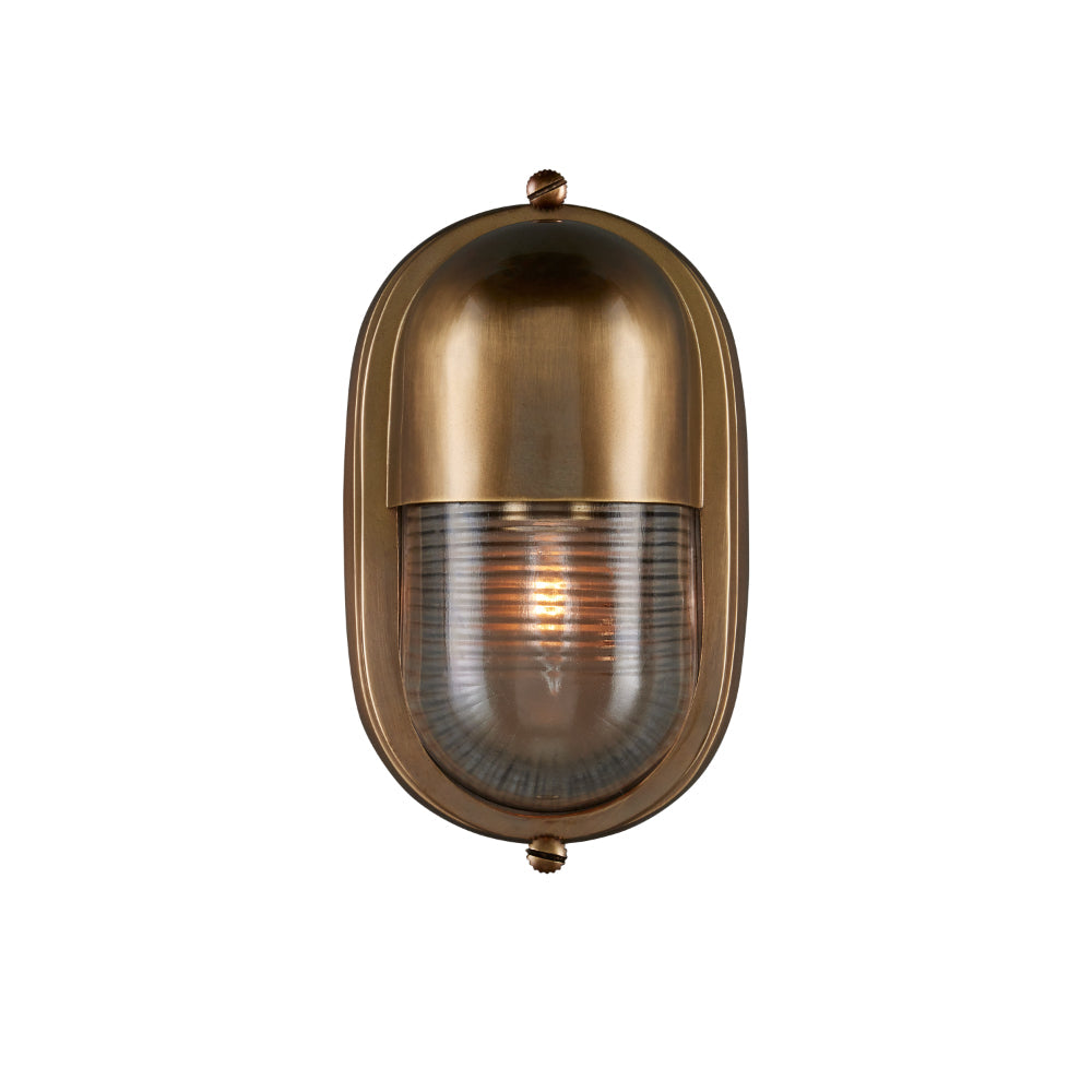 The Maritime Brass Outdoor Wall Sconce has its sea legs, so to speak, given it has the quintessential design attributes that have sailed the oceans for centuries. The antique brass body holds the ribbed glass shade in place. This gold outdoor sconce is a perfect choice for coastal environments given its stylistic notes harken to luxury yachts and schooners.