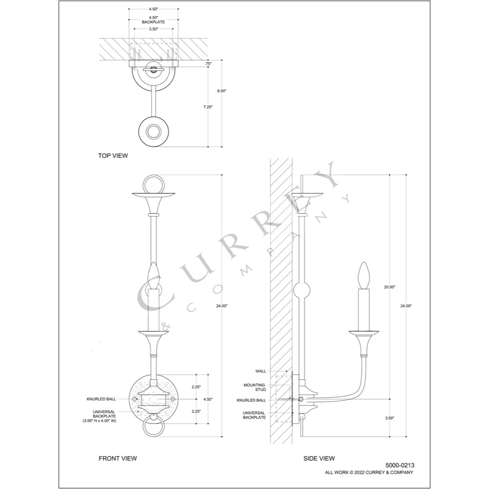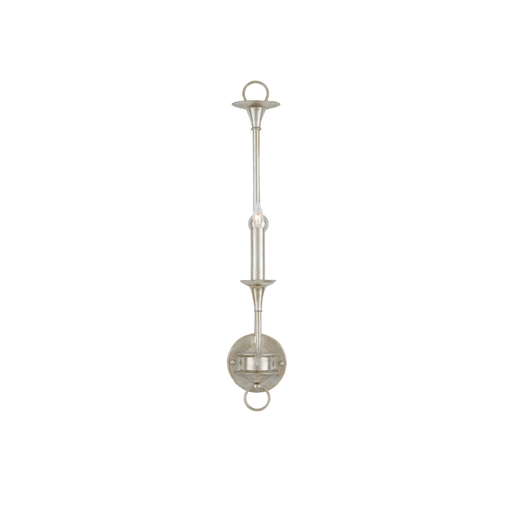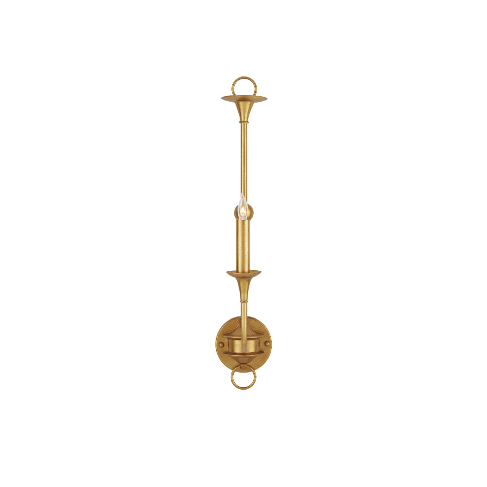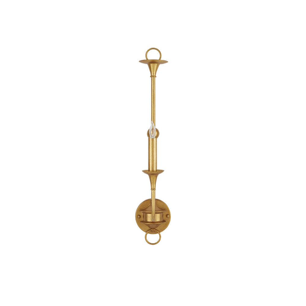 The arm of the Nottaway Gold Wall Sconce stretches gracefully from a half-spool shape that rests at the bottom of its stem, ornamented with a dainty ring. Though this is a seriously minimalist fixture, the profile of the gold wall sconce has a lovely fluidity to it that also makes it a natural choice for traditional and transitional interiors. The contemporary gold leaf finish on the wrought iron frame adds a very subtle textural interest.