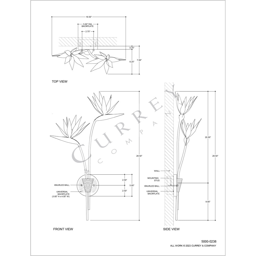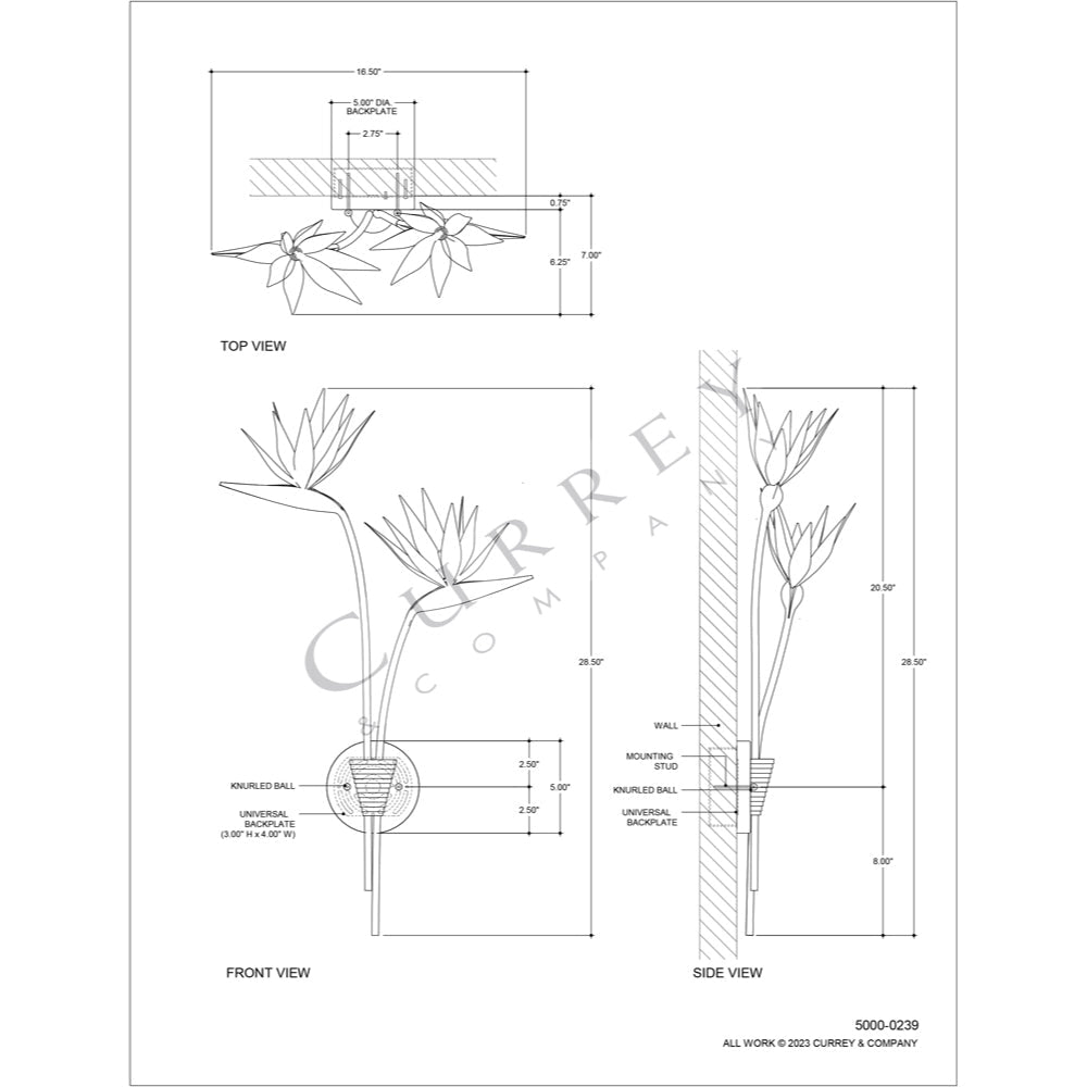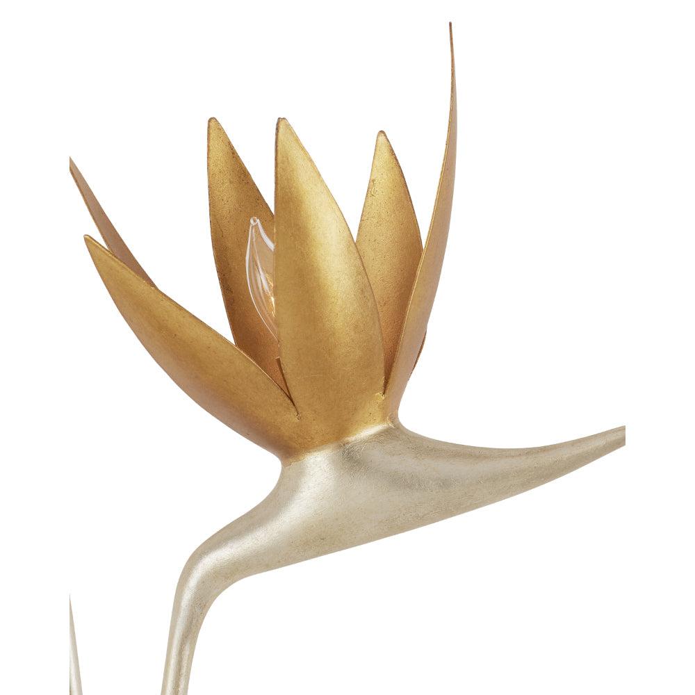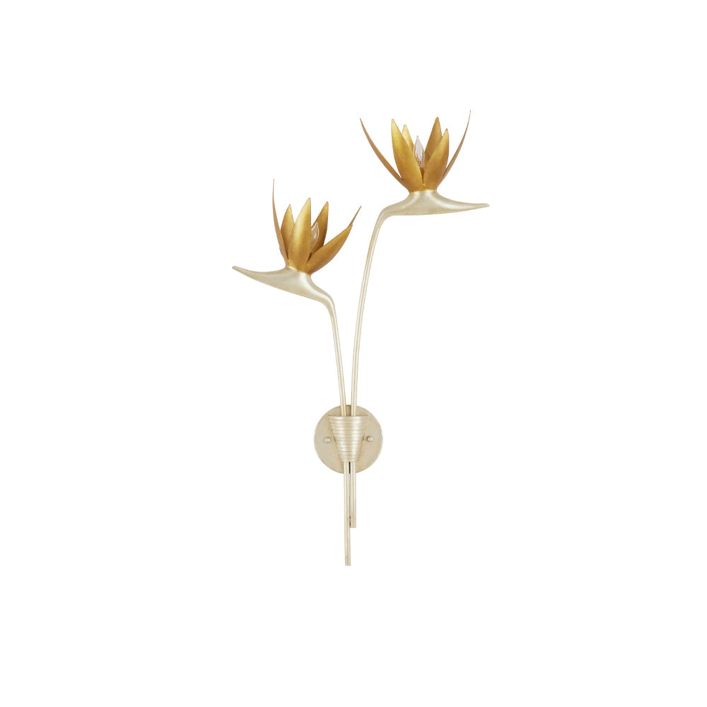 Made of steel, the right-facing Paradiso Gold & Silver Wall Sconce has a lyrical shape inspired by the Strelitzia reginae, more commonly known as the Bird of Paradise plant. The limbs that arc up and away from a central cone are in a contemporary silver leaf finish, while the blossoms that flow around the light bulbs are in a contemporary gold leaf finish. This silver and gold sconce is an example of how nature-inspired design elements are driving the biophilic movement.