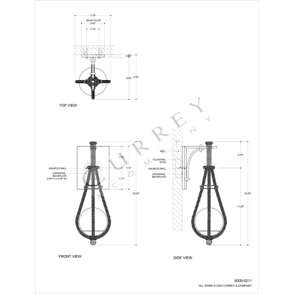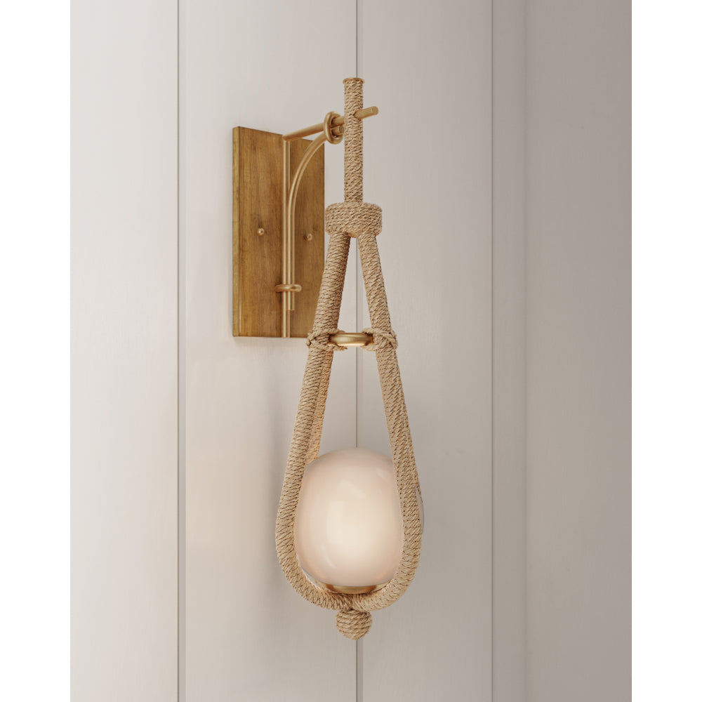 The Passageway Wall Sconce has so many layered details that exude texture, it is a design to study: the wall plate, central ring, and cup that holds the frosted glass globe are warm in a dorado gold finish; the rope-wrapped, pear-shaped element so cleverly dangles from the stem affixed to the wall plate; and the bottom finial unscrews to release one arm so that the glass globe can be removed to change the bulb. This rope wall sconce will be a perfect choice for beachside condos and lakeside homes.