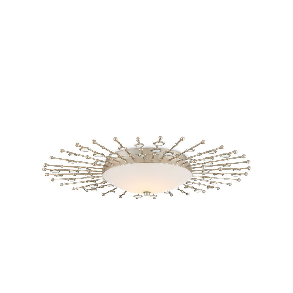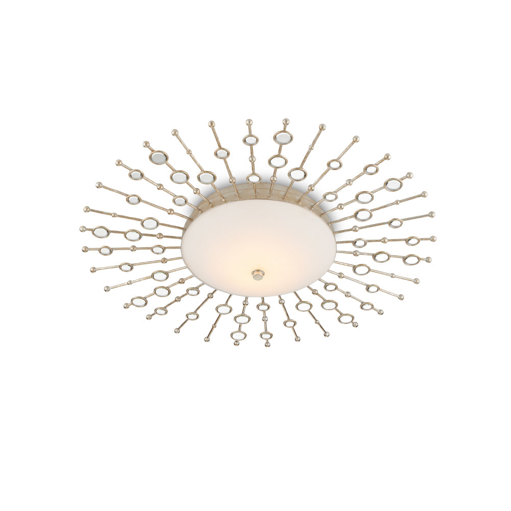 The heavenly profile of the Planisphere Flush Mount, which has a very low profile at a mere four inches from the ceiling, takes inspiration from mid-century modern wall decor while incorporating a contemporary feel into the classic style. The beveled circlets, made of frosted glass, fit seamlessly into the spokes in a silver leaf finish. This silver ceiling light glows with integrated LED technology.