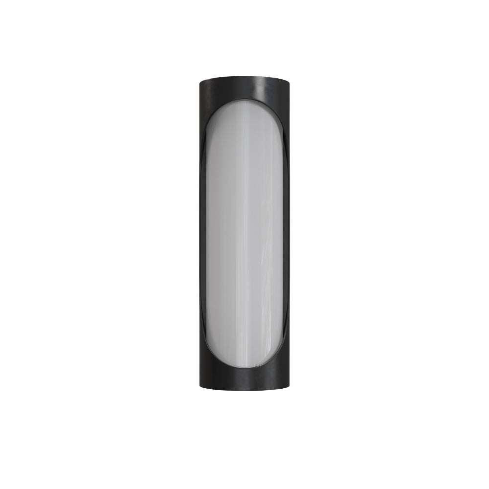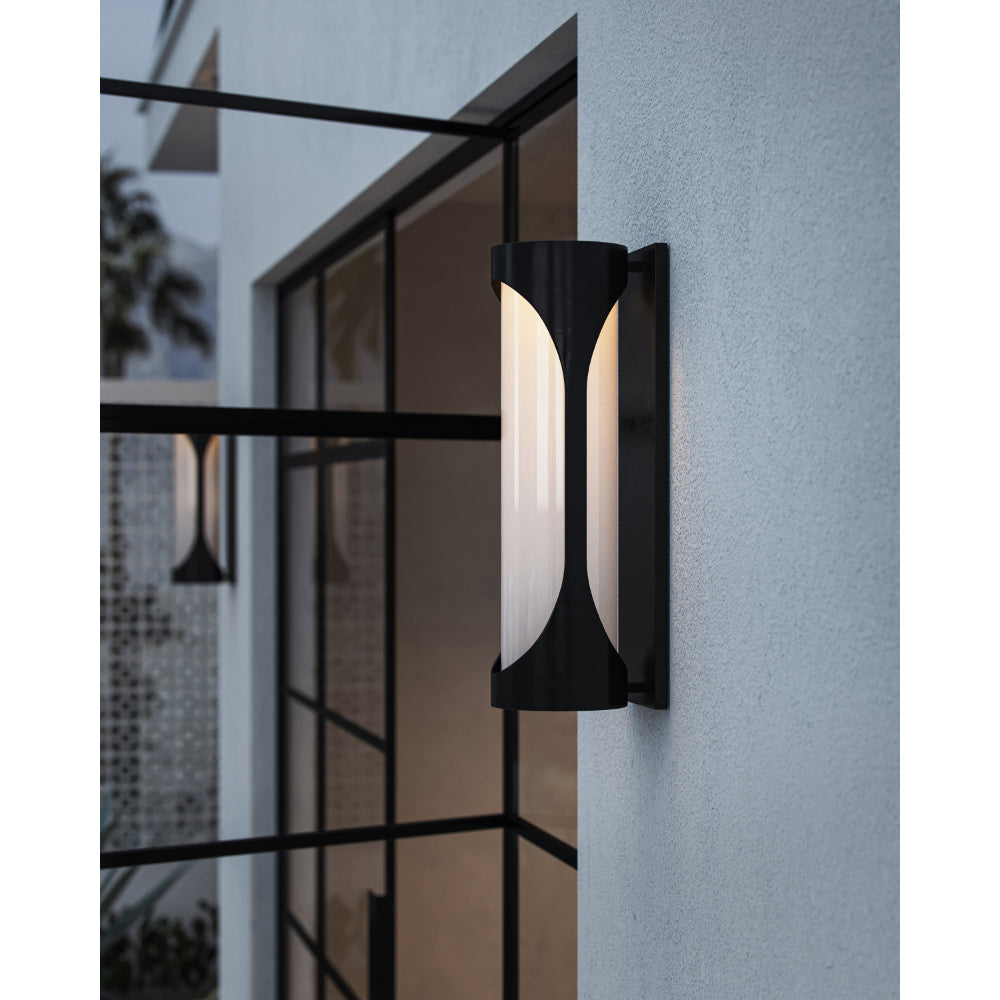 The Swale Small Outdoor Wall Sconce has a graphic silhouette with cut outs where illumination can escape. The front of the black sconce is covered with a milky white glass that illuminates uniformly when the integrated LEDs shine through it. The metal is powdercoated to make this outdoor sconce weather worthy.