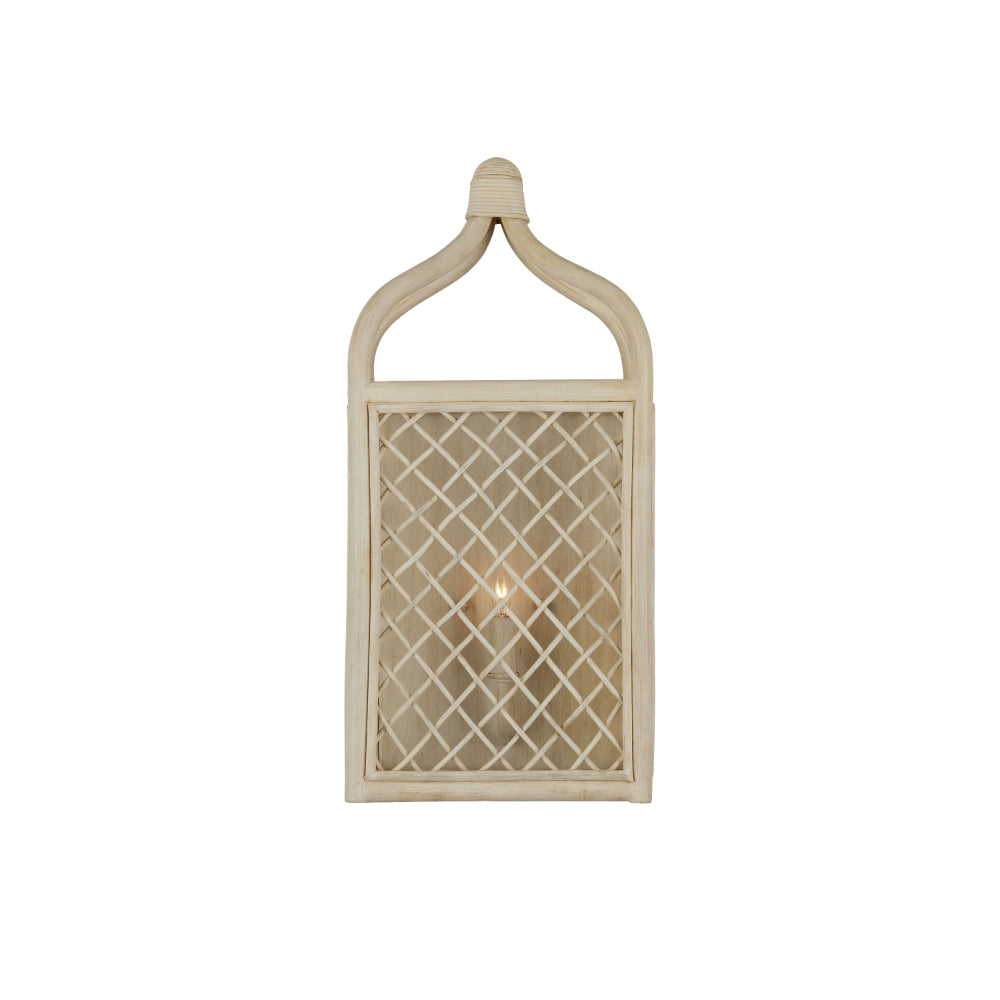 Achieving a traditional lantern shape entirely from rattan is a feat, one that was beautifully realized when artisans wove the Wanstead Ivory Wall Sconce from the natural material, slicing the normal depth in half while retaining the charm of the style. Both the thin and thick ribs intermingling to create the rattan lantern have been bleached to lighten the design. The antique Pearl finish on the hardware enhances the airiness of the beige sconce's profile.