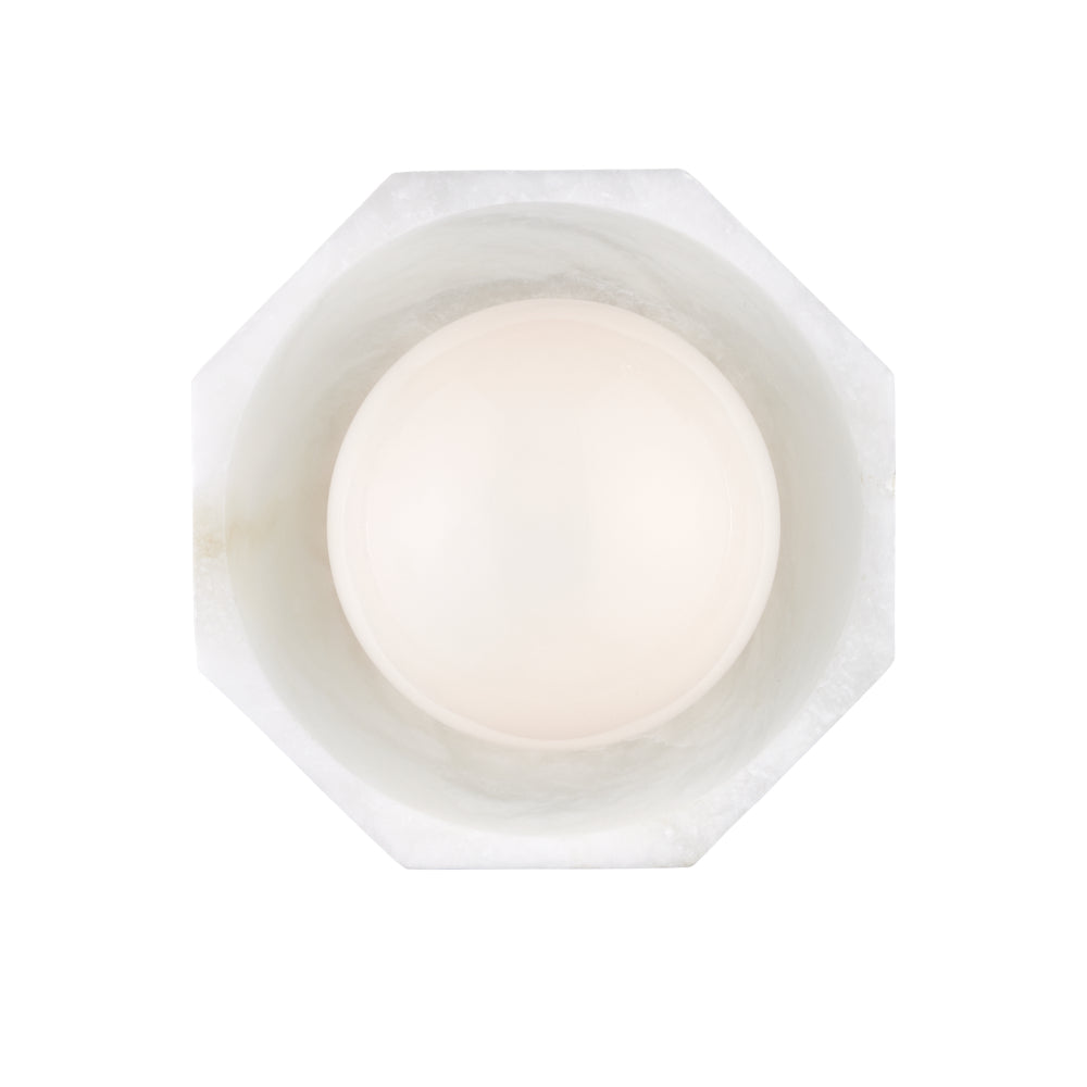 The Waystone White Wall Sconce is fitted with a large globe bulb that illuminates a bowl made of natural alabaster. The prized material has been hollowed out and carved into an octagonal shape. This alabaster sconce will gleam beautifully from its spot on the wall.