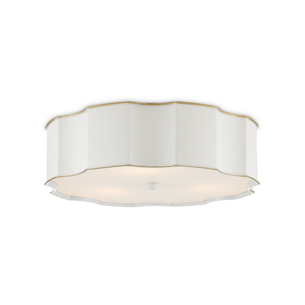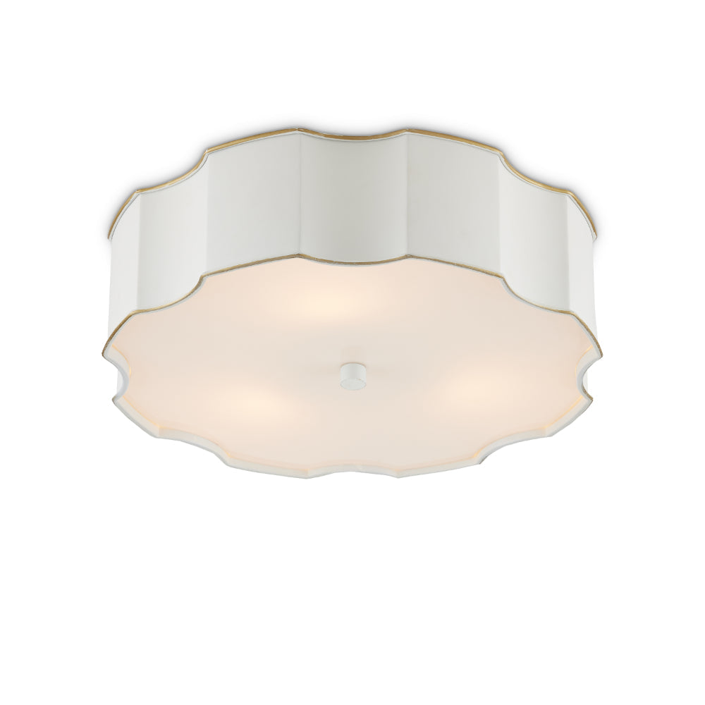 The Wexford White Flush Mount is made of metal in a snow white finish. The paleness of the surface works in concert with the soft glow produced by the opaque acrylic diffuser to create a luminous design. The matching finial that fastens the diffuser to the fixture and the scalloped shape of its profile are graceful elements.