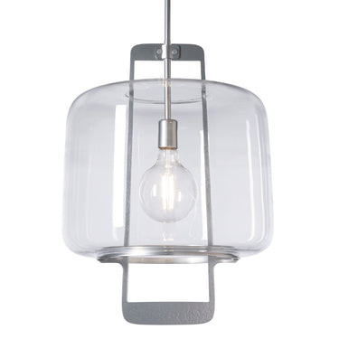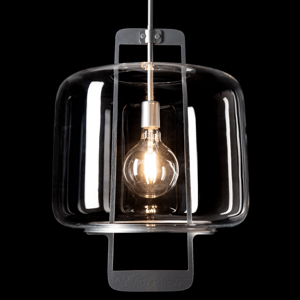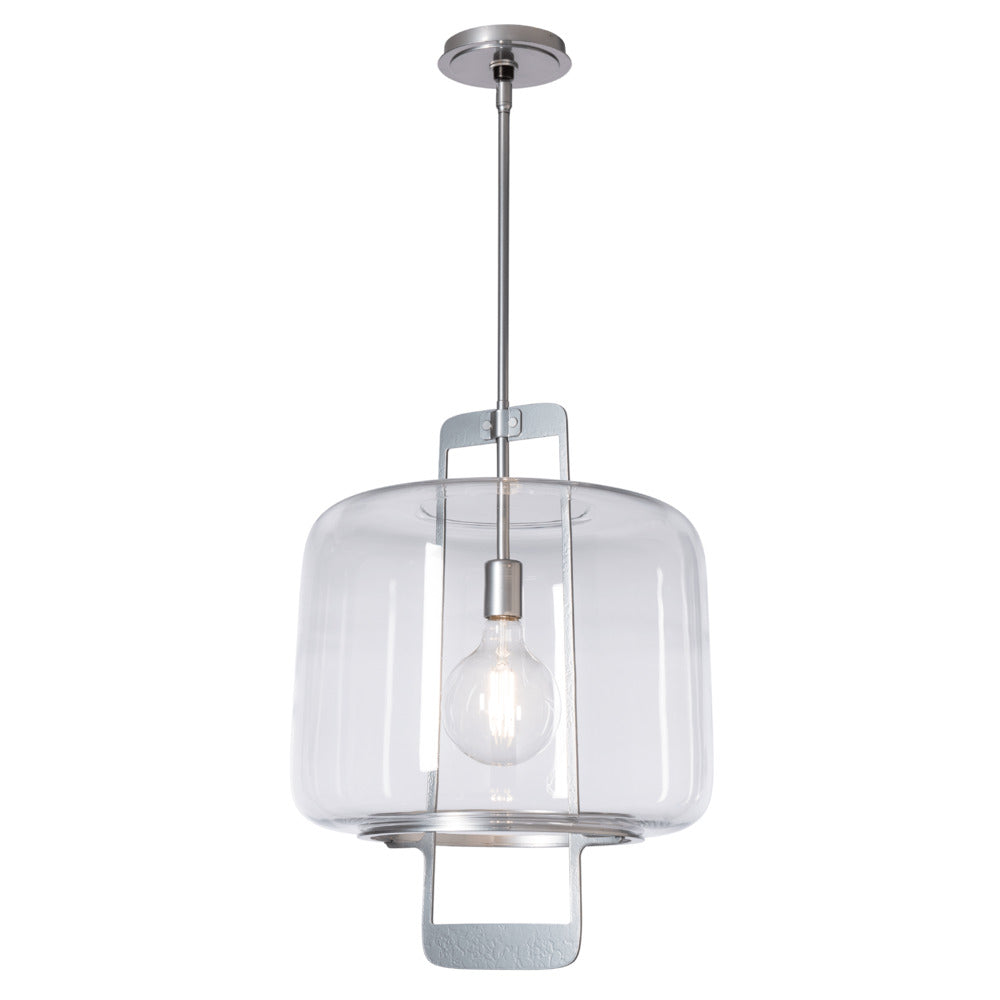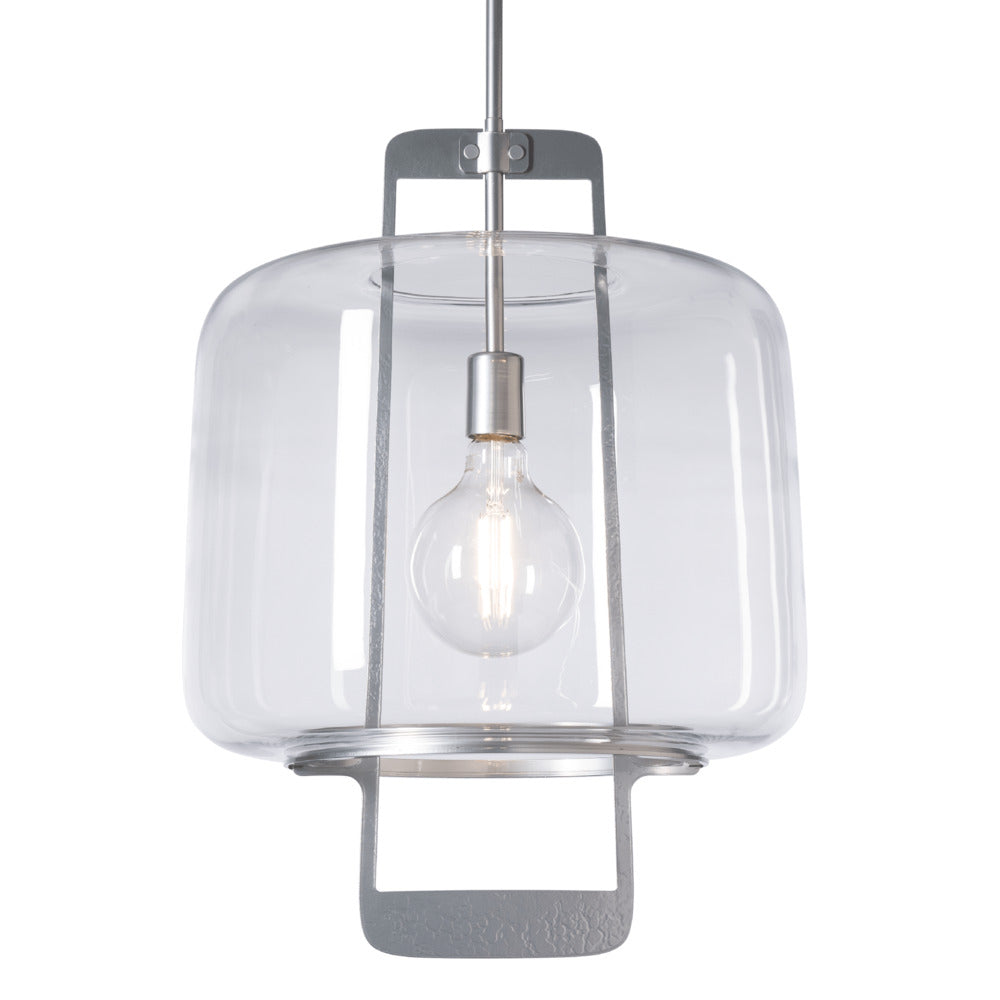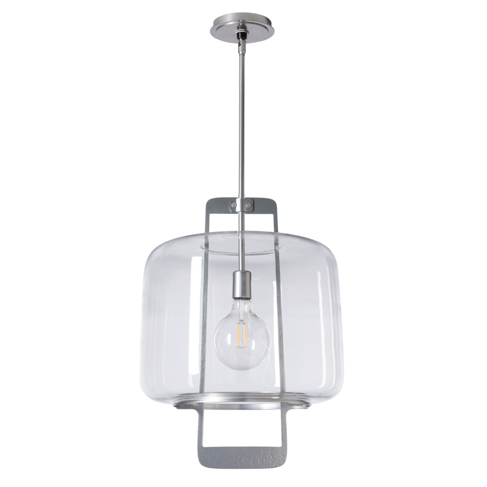 Bold geometrics are at play with the Dane Lantern. A tall, open vertical flared rectangular hand-forged steel is the focal piece for this fixture with a large glass cylinder sitting on its steel rim that houses a central bulb.