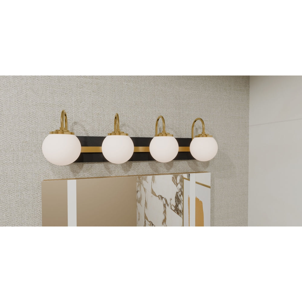 Matte black and brushed gold accents make a beautiful, modern pairing in Desmond. Opal etched glass globes complement the bold bath light design, delivering the perfect amount of illumination. Desmond is available in a variety of sizes, allowing you to easily customize to your desired vanity setting.