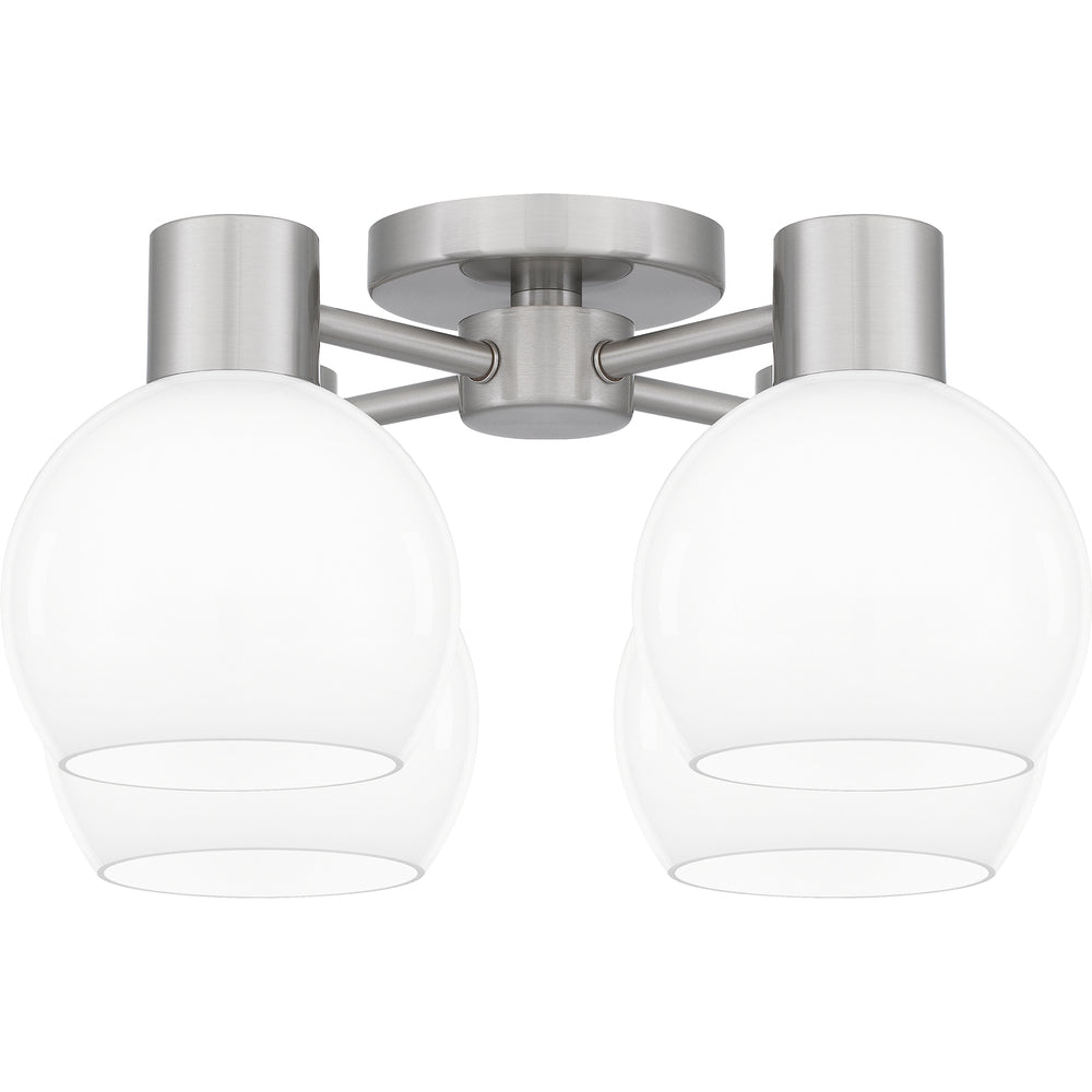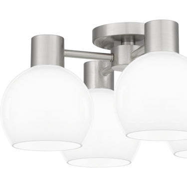 Complement any room or home decor with the transitional look of Donahue. This minimalist semi-flush mount comes in your choice of brushed nickel or matte black, two timeless finishes. The rounded opal glass shades complete the look, creating a soft glow that is perfect for any hallway, bedroom, or foyer.