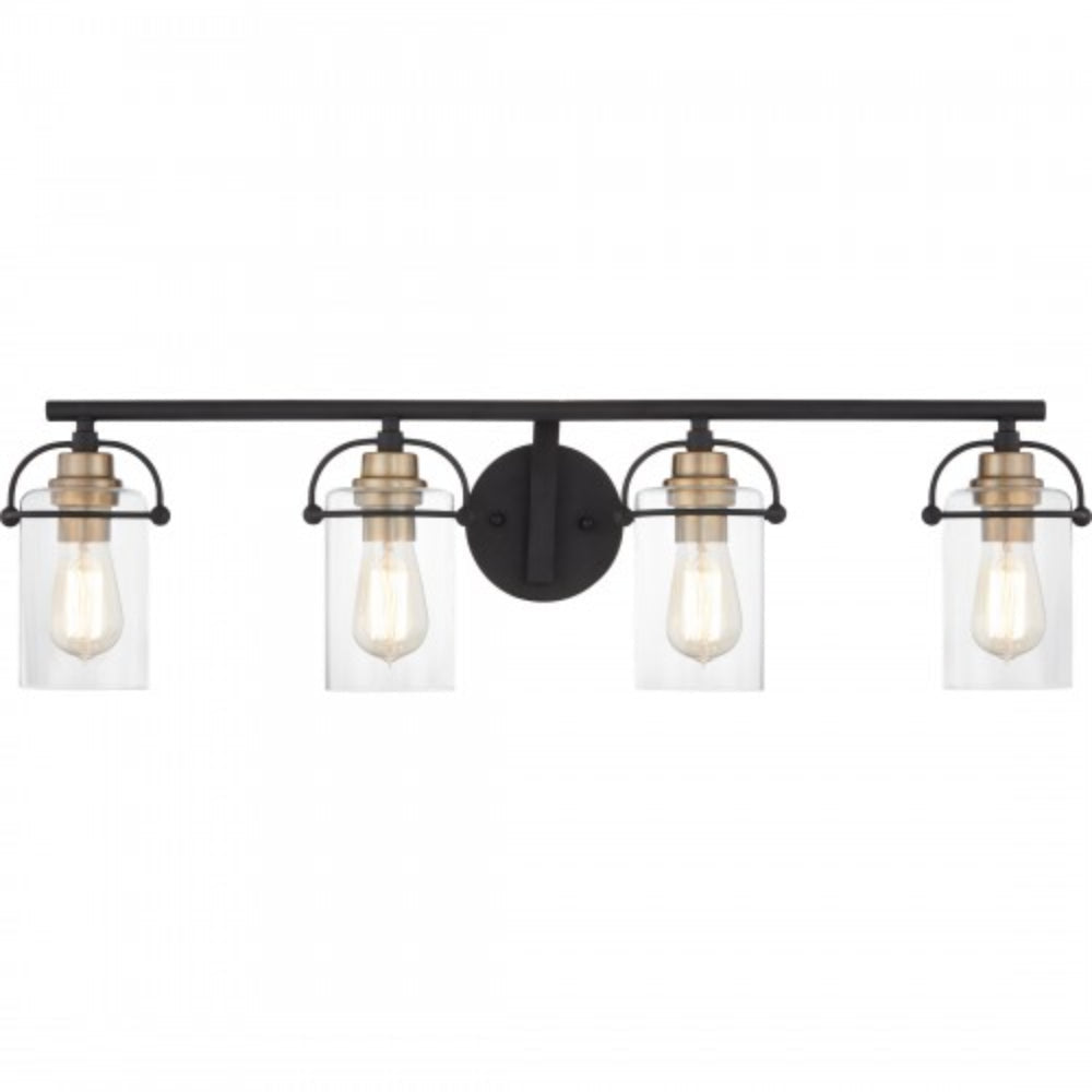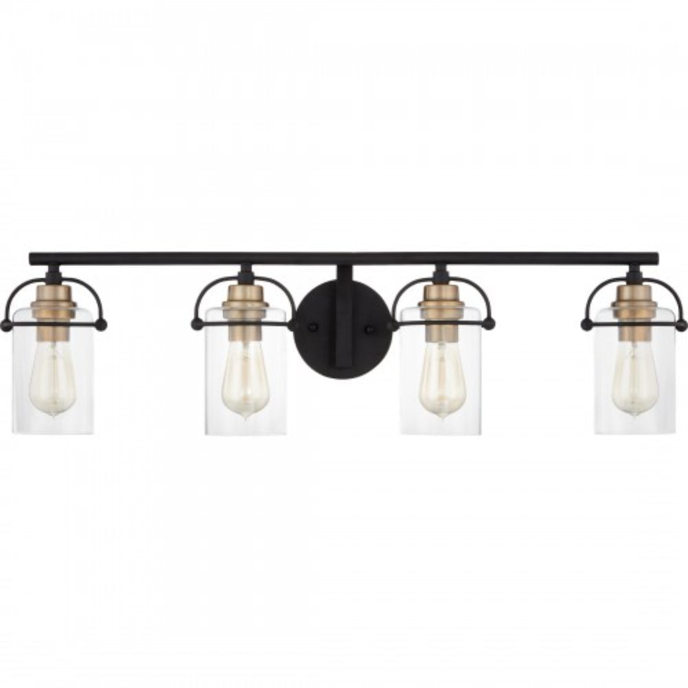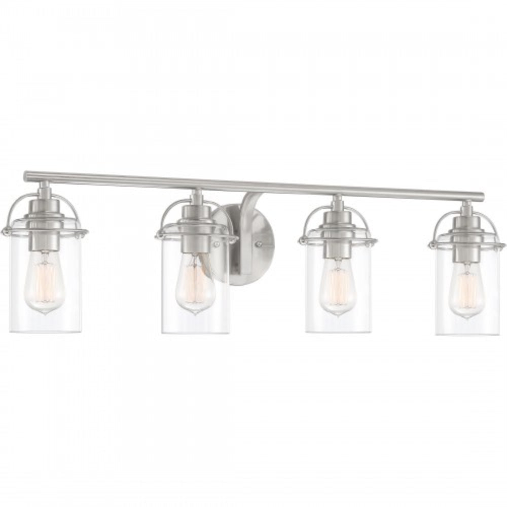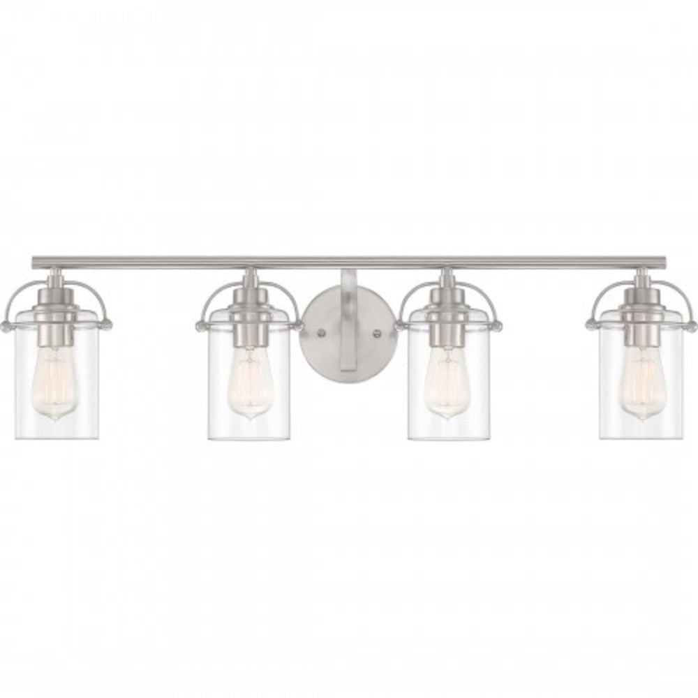 The Emerson's transitional silhouette charms with unique harness-style brackets and simple clear glass shades. Finished in a classic brushed nickel, this collection is sure to complement any decor.
