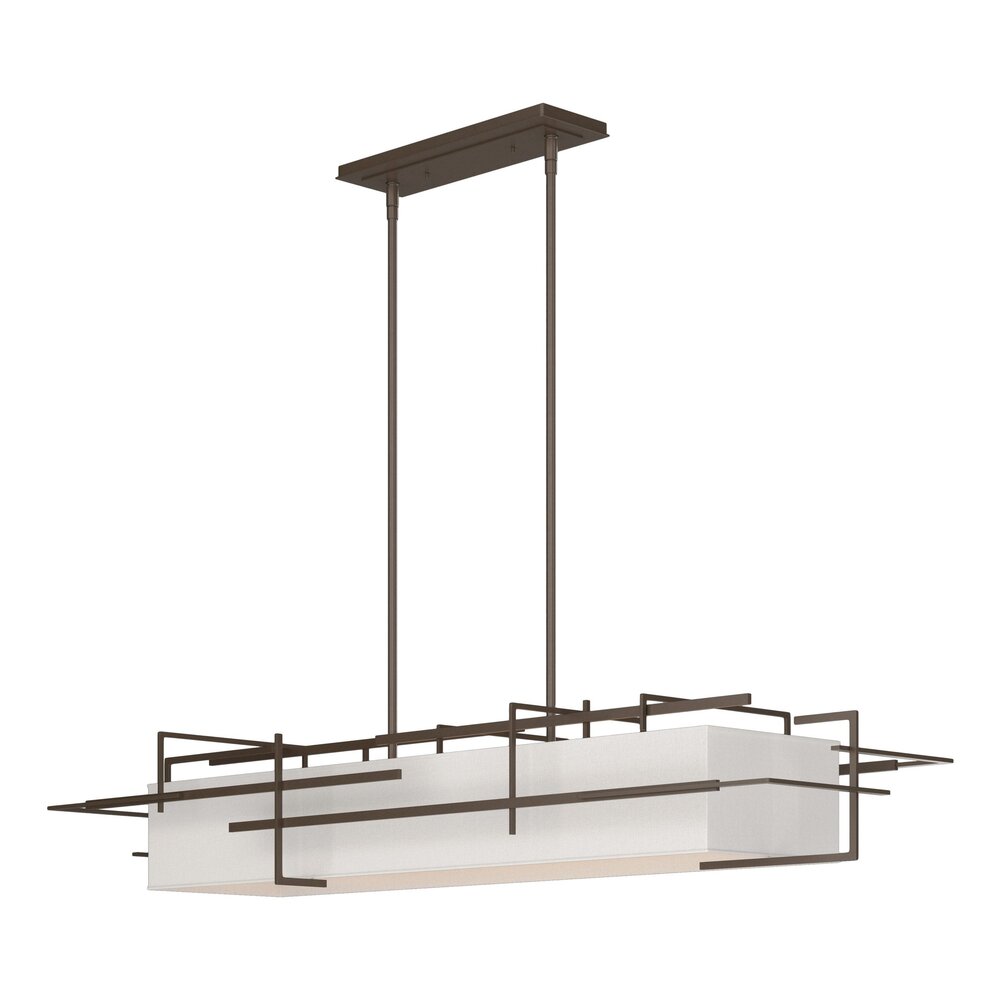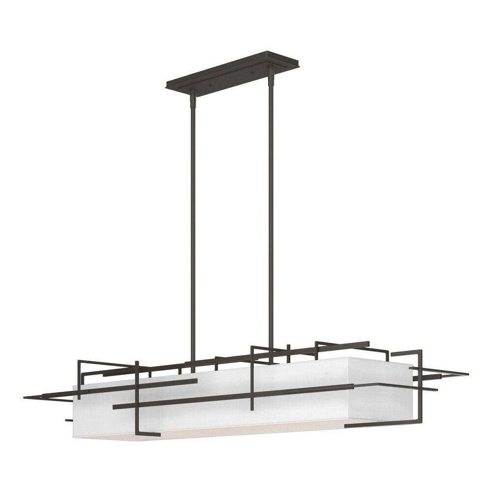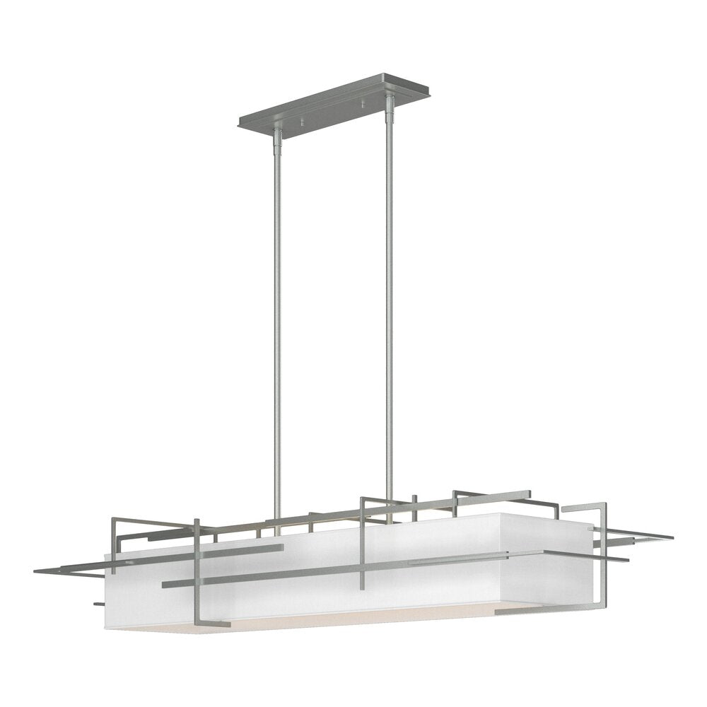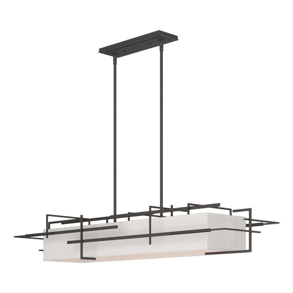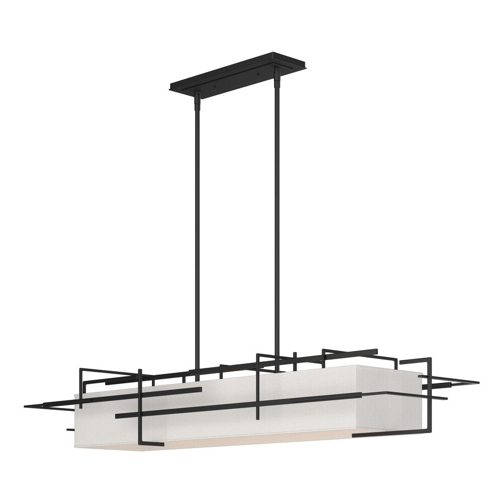 A modern take on a classic form, the Etch Pendant is full 54" in width. A classic, rectangular shade is held within an abstract, Mondrian-esque hand-forged steel exoskeleton with clean lines and angles. An impressive and versatile lighting pendant is suited to a variety of design styles.