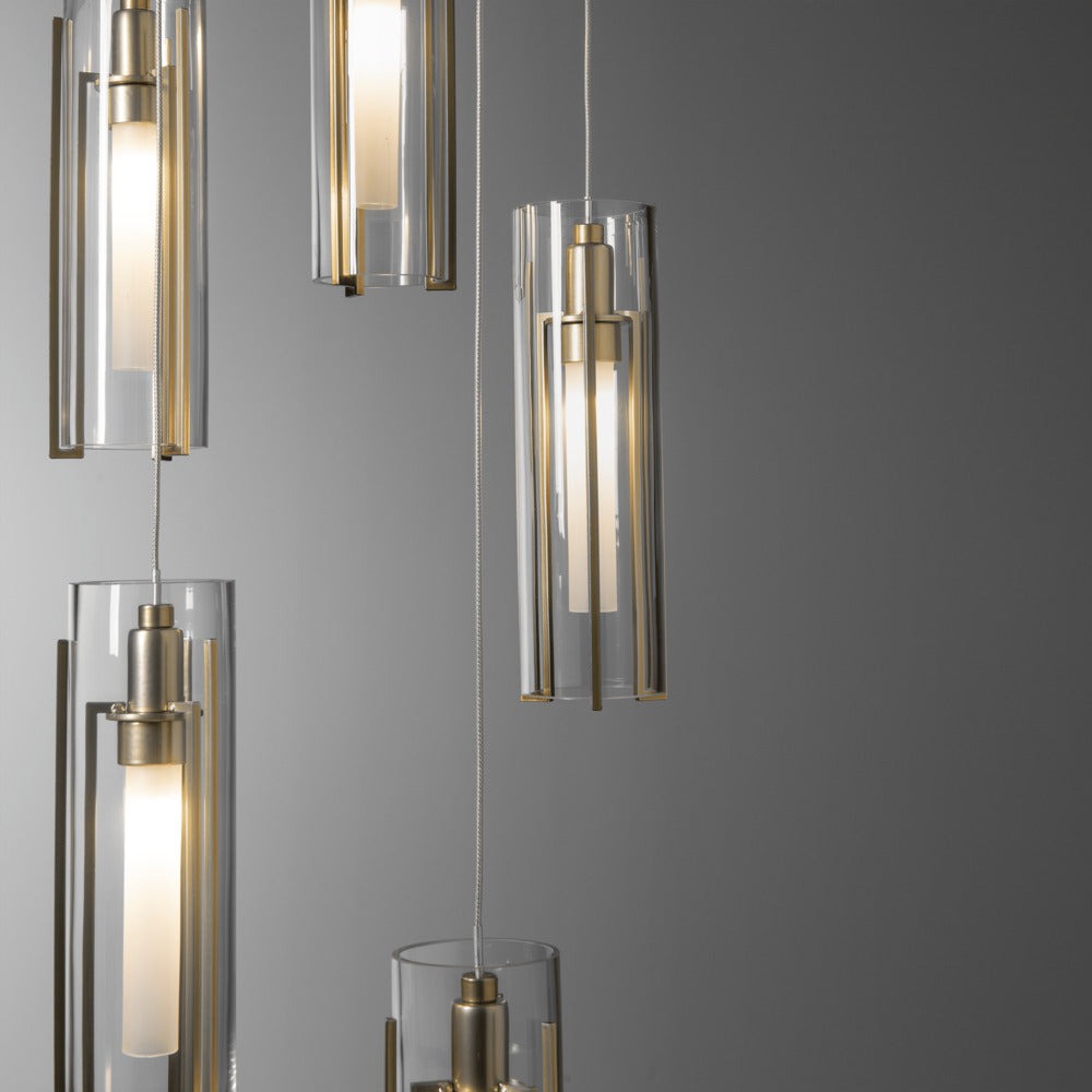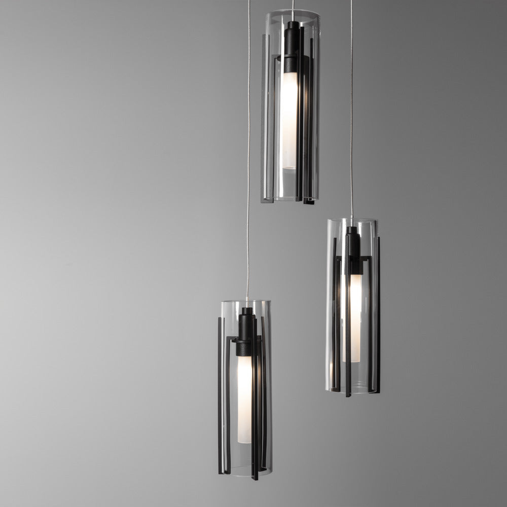 The Exos Collection has a new addition with five cascading pendants clustered on a round multi-port canopy. Individual pendant lengths are customizable to suit the space, making this Exos Glass 5-Light pendant and easy choice. With a substantial range of cable length, this Exos Glass ceiling pendant could make a dramatic statement as a semi-flush or as a cascading focal piece. Tall, vertical, handcrafted steel pieces embrace a glass shade in a choice of opal or clear glass, with an opal inner diffuser.