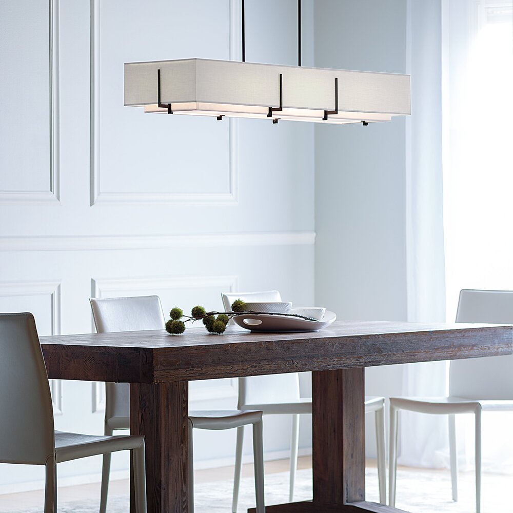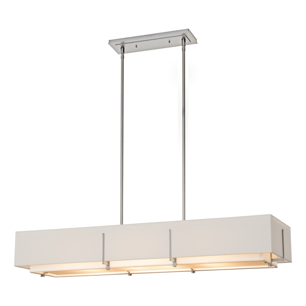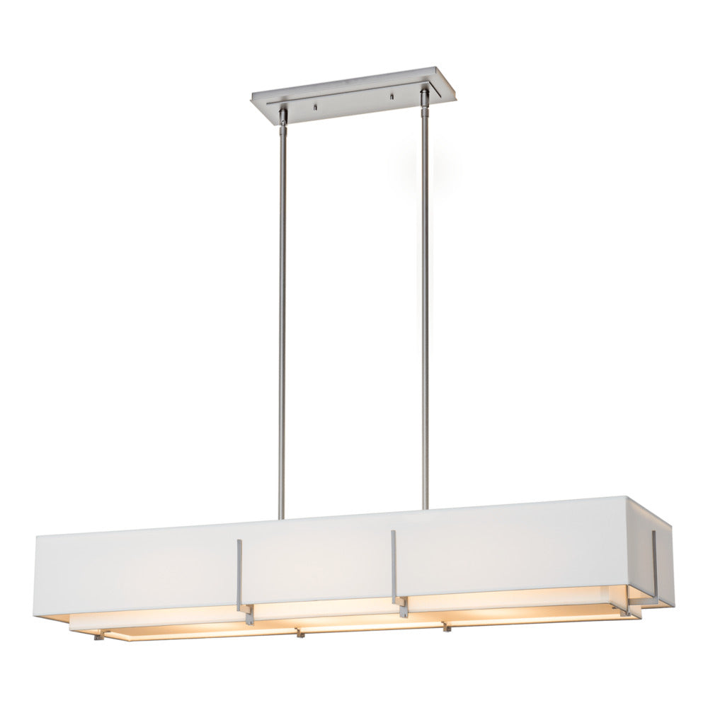 The Exos Rectangular Pendant is a much anticipated addition to our Exos collection of fixtures. The dual shades are cradled by hand-forged steel bars while multiple light sources, concealed by a frosted glass diffuser, provide even ambient illumination. Versatile and sophisticated, this large rectangular pendant is beautifully suited for both residential and commercial interiors.