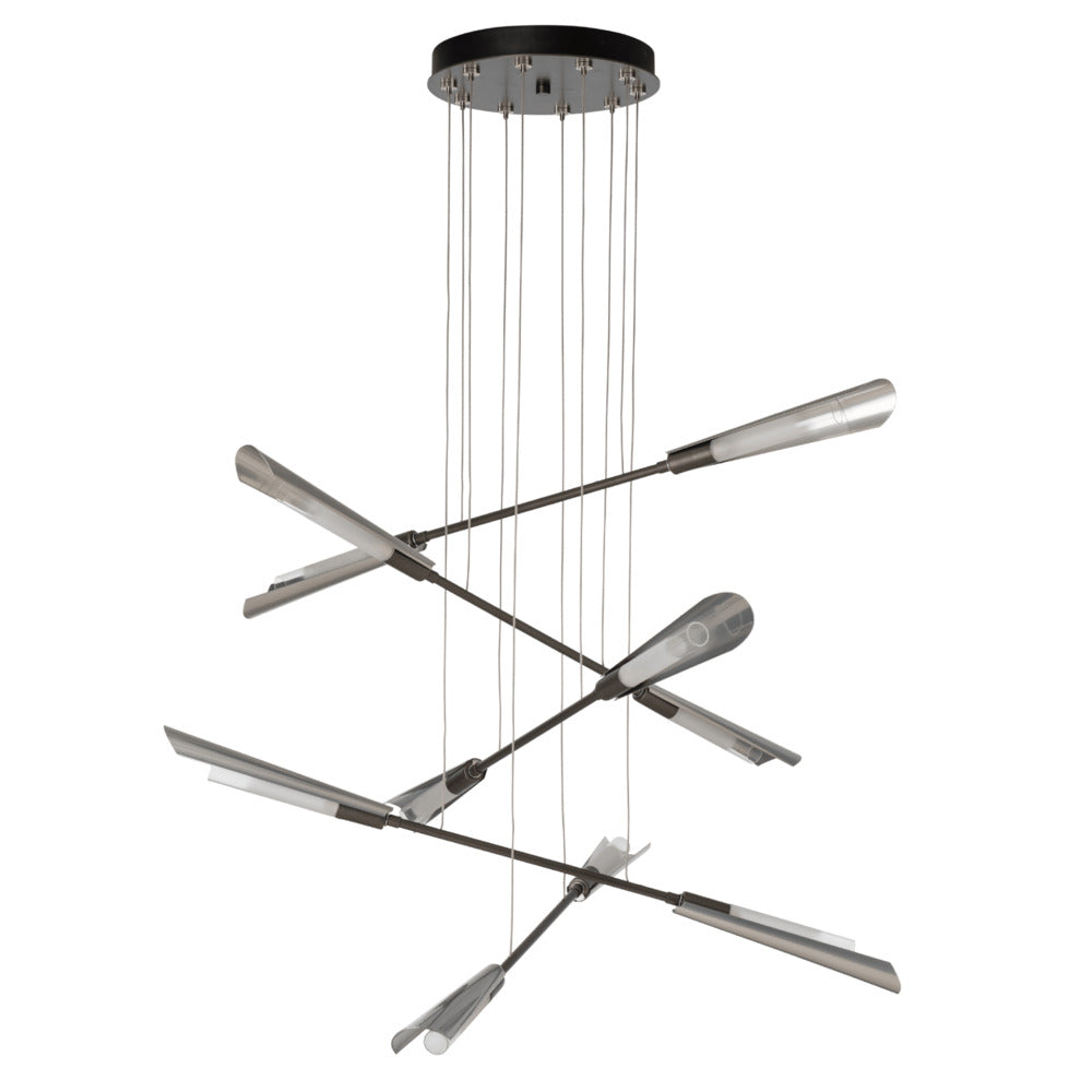 Reminiscent of a kettle of hawks soaring thermals, the Flight 10-Light Small Pendant looks stunning as a cascading pendant in a stairwell or entry; or positioned close to ceiling in dynamic effect, thanks to its highly-adjustable design. Ombre borosilicate glass tube diffusers enclose the bulbs while adjustable curved metal reflectors direct and shield each light.