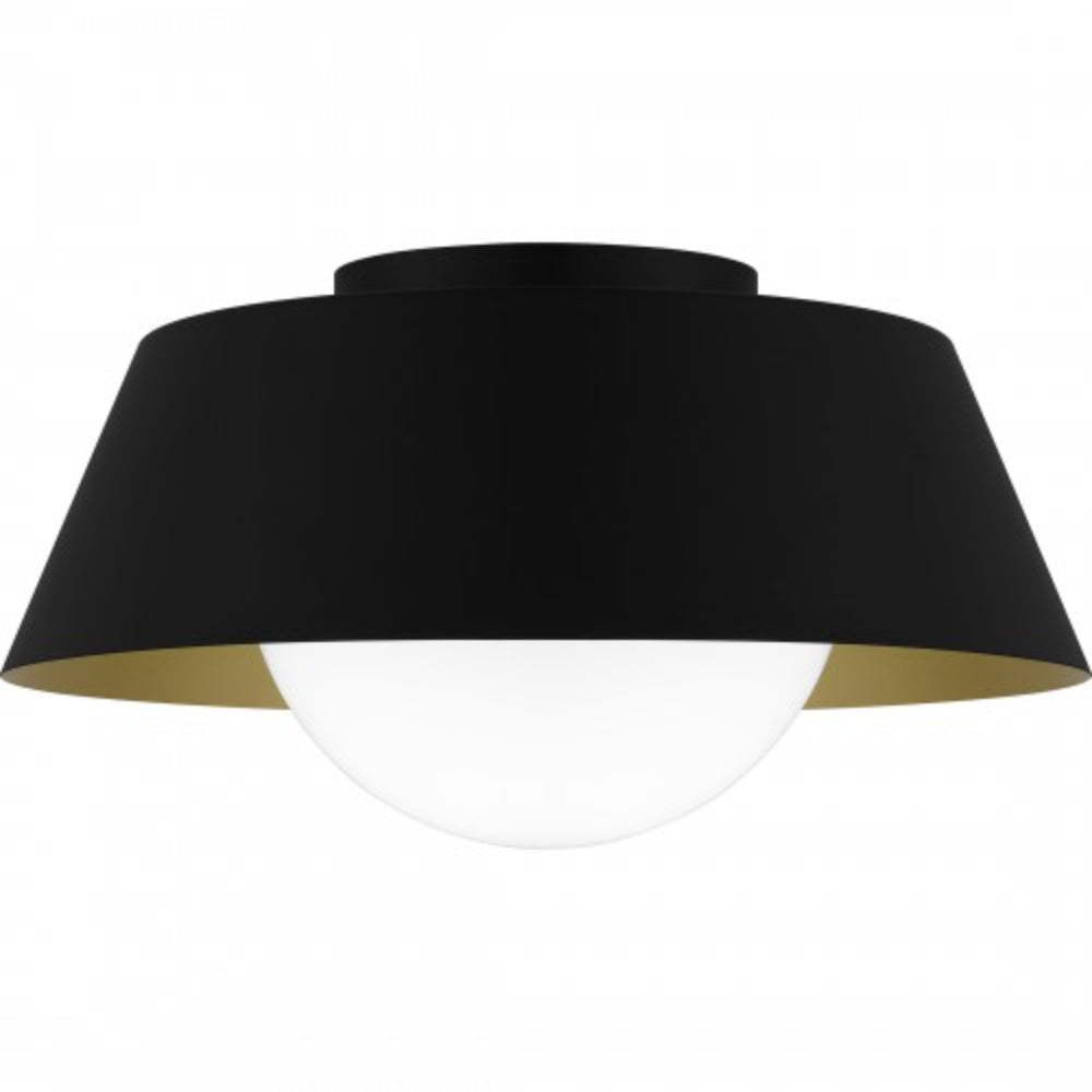 The transitional style of the Damascus flush mount is both sleek and modern. A simple drum silhouette is finished in matte black on the outside, painted with a warm brass interior for optimal illumination. An opal glass globe completes the overall look, making Damascus a perfect choice in any space.