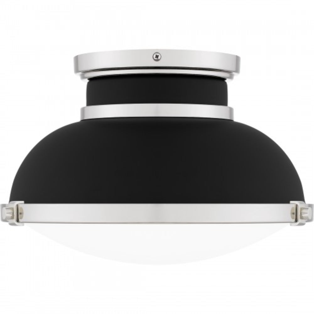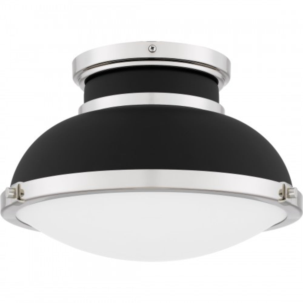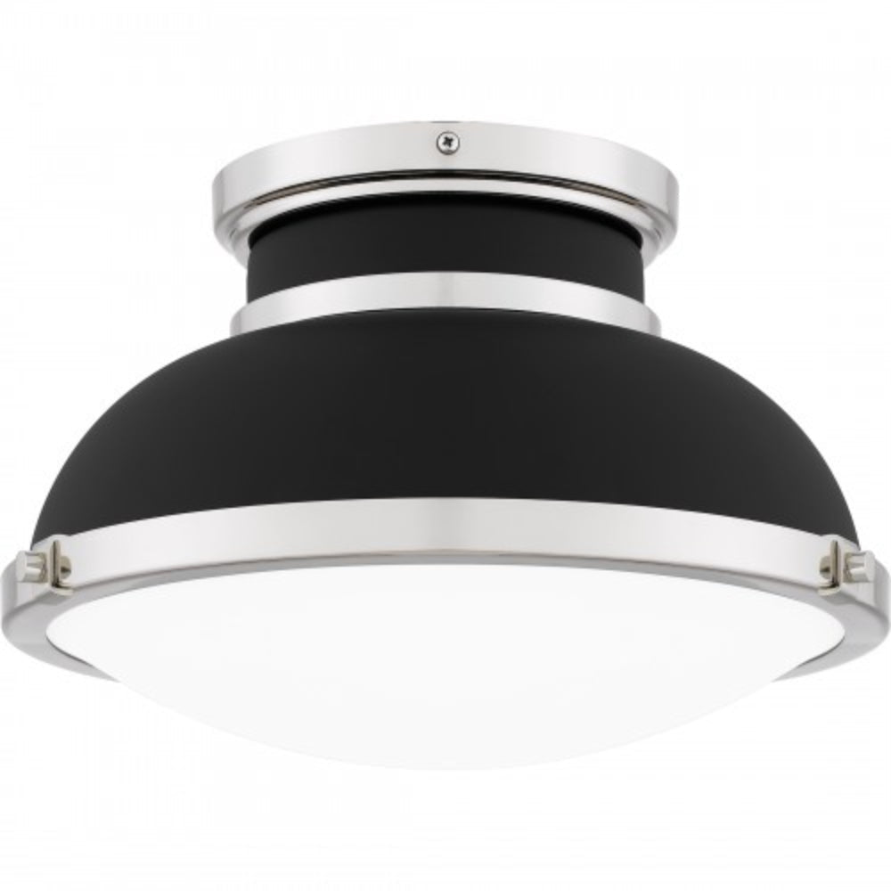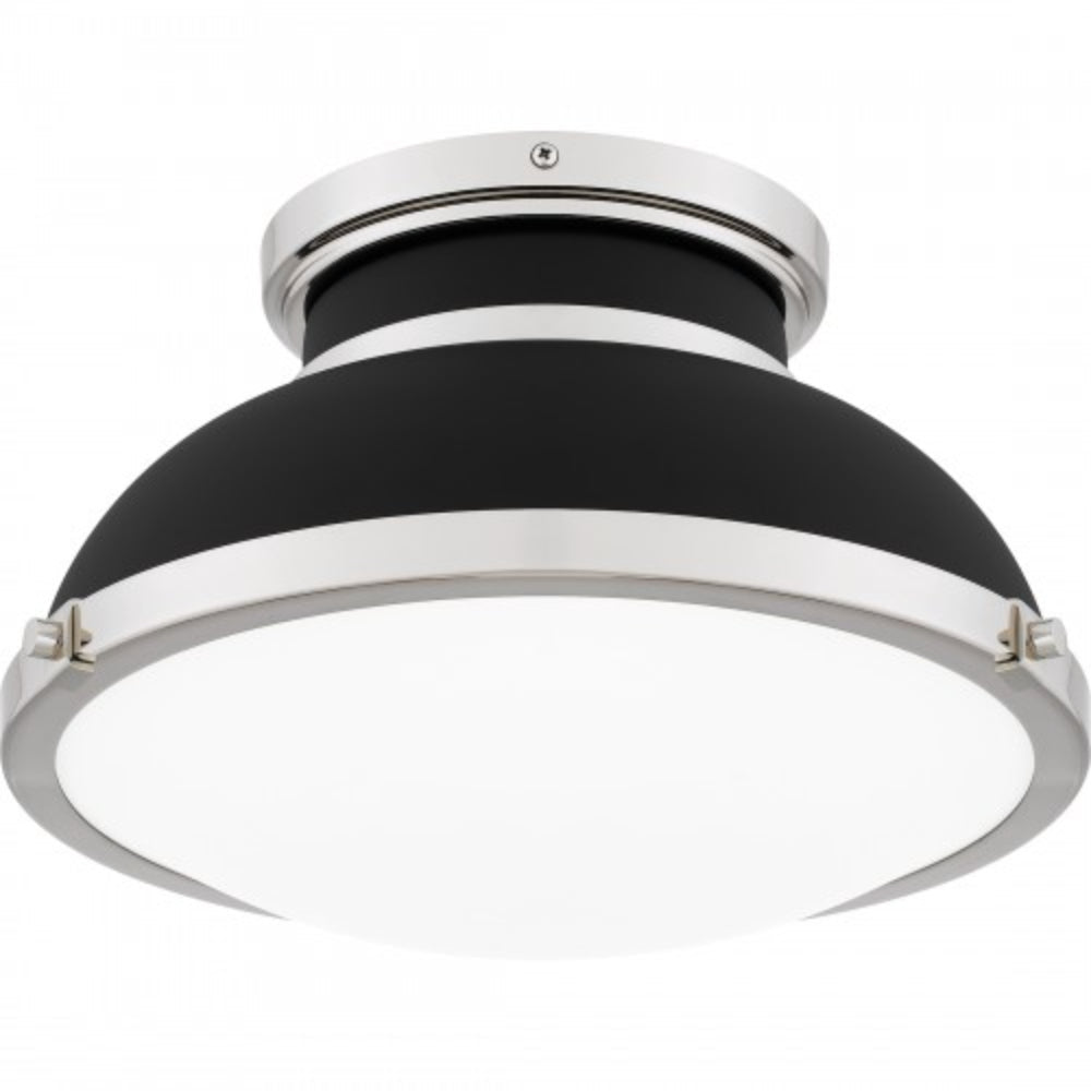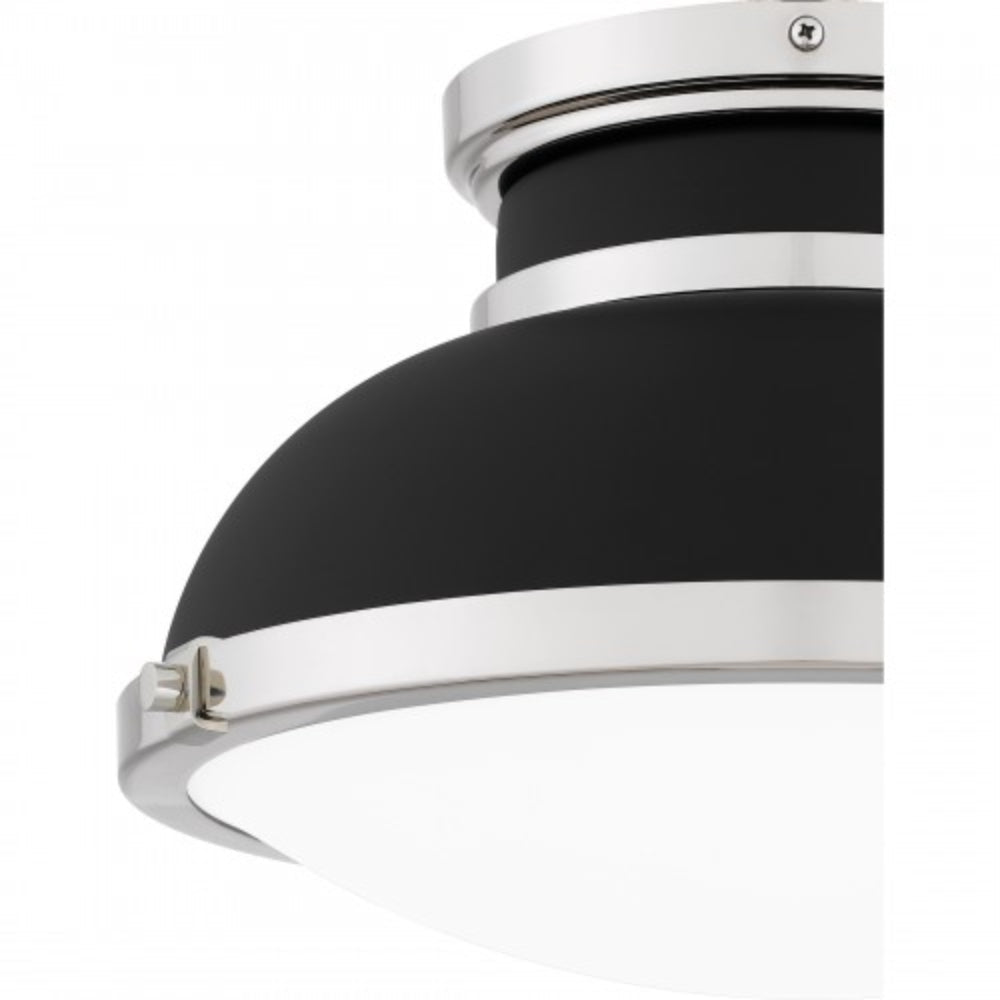 A classic design with industrial style elements, Tobias is a true standout piece in any room. The flush mount ceiling light features a matte black metal shade, accentuated by sleek polished nickel accents for a beautiful and shining contrast. A clear etched glass shade completes the look, delivering a soft glow in any hallway or home office.