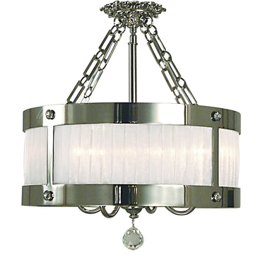 Pleated fabric shade is encased in a metal frame and suspended by chain link from the ceiling canopy. Every Framburg lighting product is hand made in the USA.