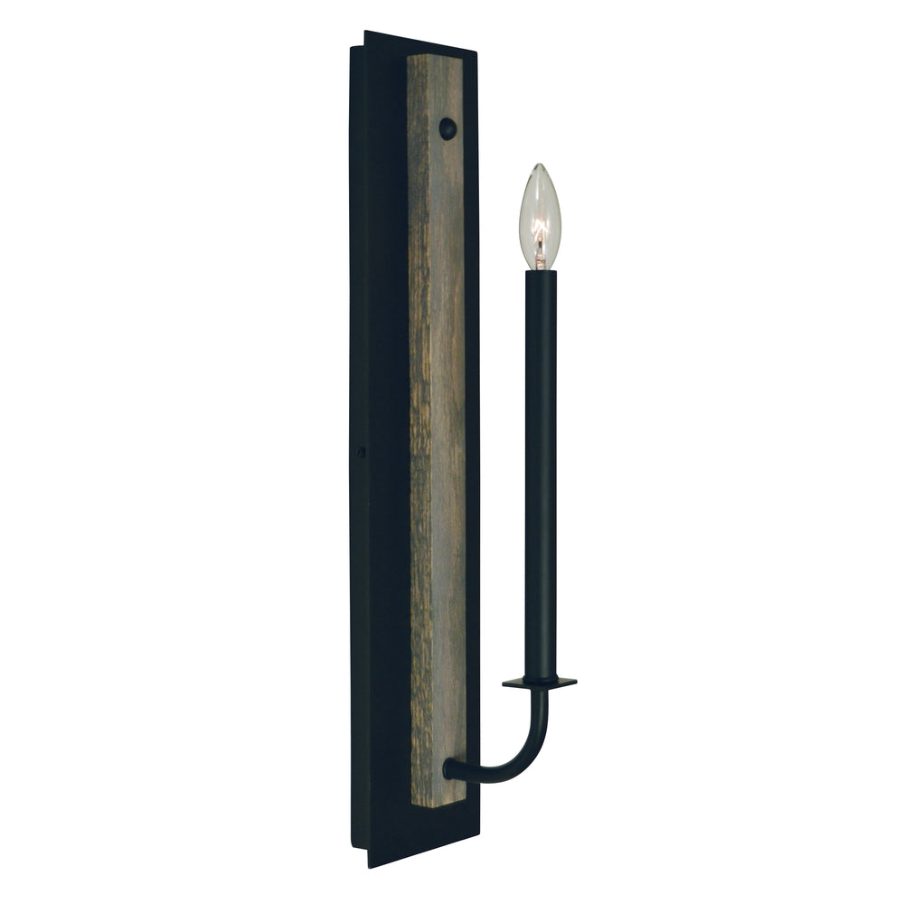 Matte Black finish with a stained grey oak wood accents are graced with 11" tall candles. Each Framburg lighting fixture is manufactured in the USA.