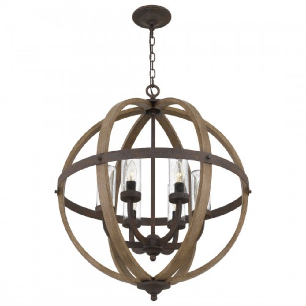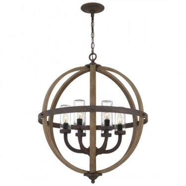 Aptly named, the Fusion pendant marries rustic and traditional designs to stunning effect. The stylized design takes inspiration from medieval lighting, yet with a modern overhaul made for today's living. Safe to use inside or out, this piece features wood and steel elements to create patina while clear, seeded glass shades add a touch of levity and charm.