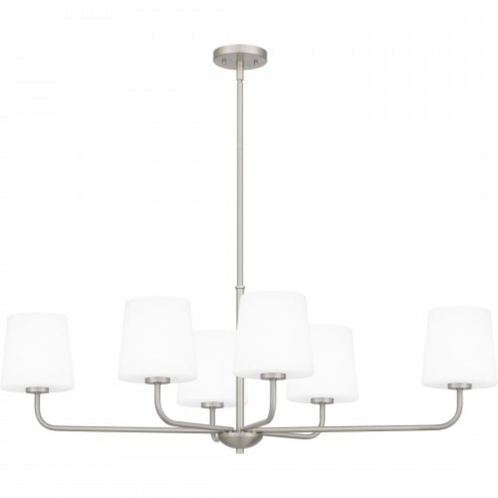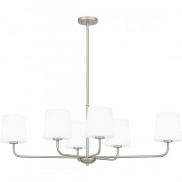 Available in a variety of sizes, Gallagher chandeliers offer the perfect complement to any space. Choose from a classic brushed nickel finish with opal etched glass shades- or go the more modern route with a matte black finish and white fabric shades. Whichever you choose, Gallagher is sure to impress with its transitional styling.