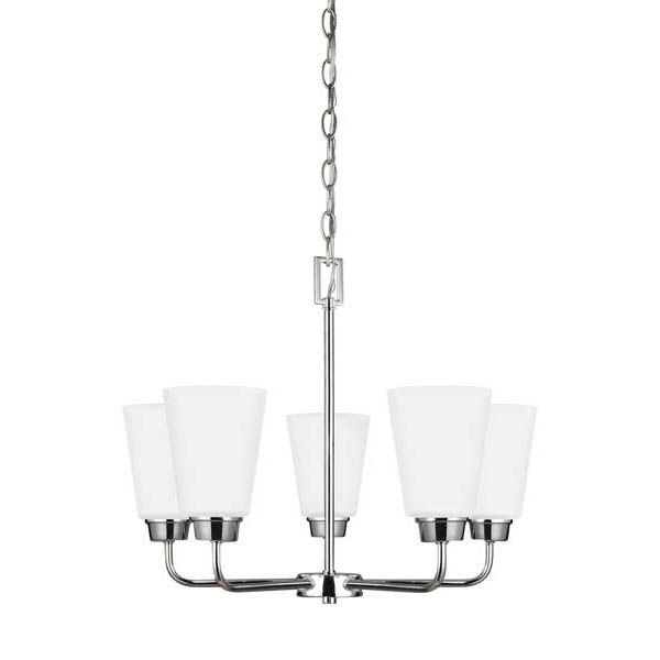 The Kerrville five light single tier chandelier in chrome enhances the beauty of your home with ample light and style to match today's trends. With a simple, airy appearance, the Kerrville lighting collection by embraces its modern design roots while enhancing virtually any homes decor. Tubular steel arms extend outward and curve to present beautiful tapered, Satin Etched glass shades. The collection has a Brushed Nickel, Burnt Sienna or Chrome finish and offers three-, five- and nine-light chandeliers, a one-light mini pendant, one- and three-light pendants, a two-light semi-flush mount which can convert to a pendant, and one-, two-, three- and four-light bath fixtures. Incandescent and ENERGY STAR-qualified LED lamping are available; all fixtures are California Title 24 compliant.