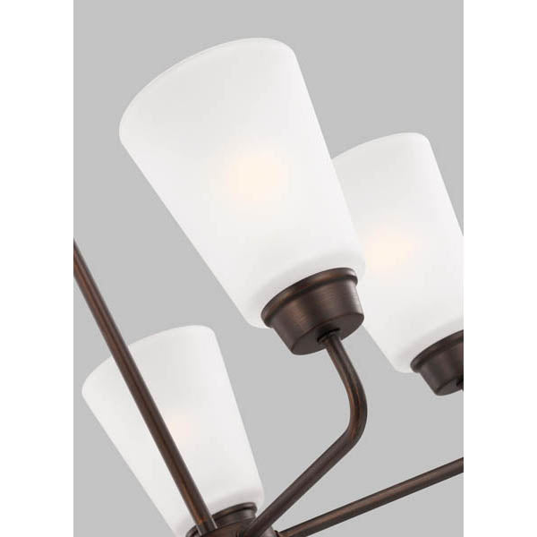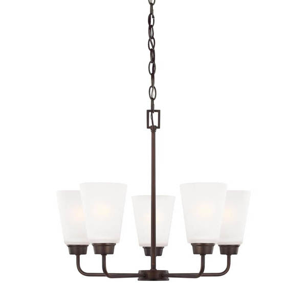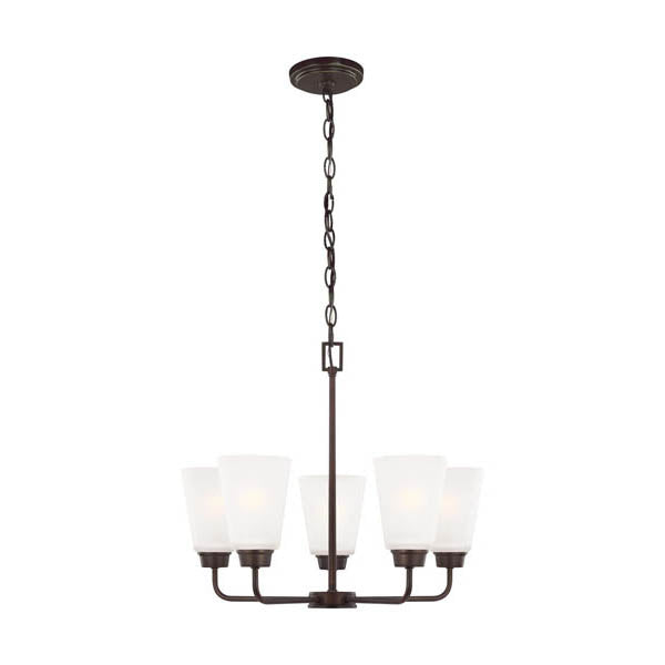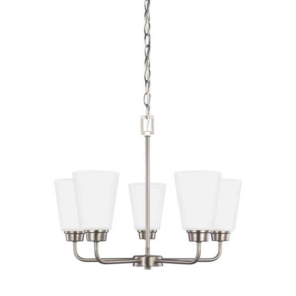 The Kerrville five light single tier chandelier enhances the beauty of your home with ample light and style to match today's trends. With a simple, airy appearance, the Kerrville lighting collection by embraces its modern design roots while enhancing virtually any homes decor. Tubular steel arms extend outward and curve to present beautiful tapered, Satin Etched glass shades. The collection has a Brushed Nickel, Burnt Sienna or Chrome finish and offers three-, five- and nine-light chandeliers, a one-light mini pendant, one- and three-light pendants, a two-light semi-flush mount which can convert to a pendant, and one-, two-, three- and four-light bath fixtures. Incandescent and ENERGY STAR-qualified LED lamping are available; all fixtures are California Title 24 compliant.