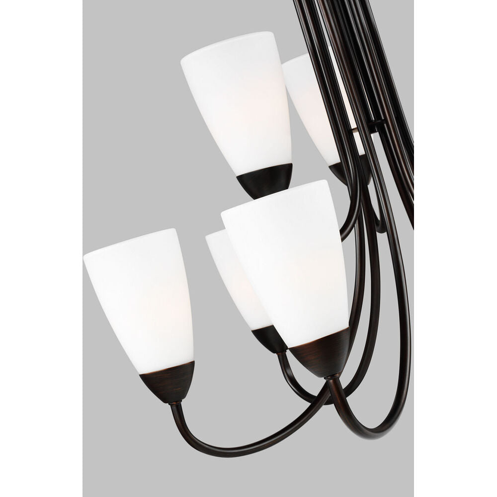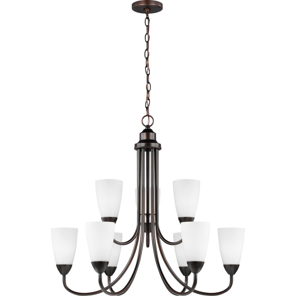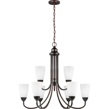 The Seville nine light multi tier chandelier in bronze supplies ample lighting for your daily needs, while adding a layer of today's style to your home's decor. The Seville collection represents commitment to high style at a sharp price. The modernist design is epitomized by the teardrop curves in the arms tipped by Etched glass diffusors throughout the chandeliers and bath fixtures. The collection offers a "whole home" lighting solution in every imaginable category. The assortment includes nine-light, five-light, and three-light chandeliers (either with up-light or down-light), pendants in four sizes as well as one-light, two-light, three-light , four-light and five-light wall/bath fixtures. Install a stylish and elegant addition to any room in the house. Seville is offered and Burnt Sienna finishes.