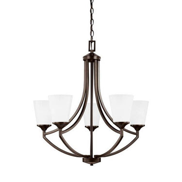 The Hanford five light single tier chandelier in bronze provides abundant light to your home, while adding style and interest. The transitional styling of the Hanford lighting collection by is evident in its elegant symmetry articulated by long, sweeping arms. Tapered Etched glass shades produce a soft up light and make Hanford complementary to a wide array of decor from traditional to contemporary. Offered in both Brushed Nickel and Burnt Sienna finishes, the collection includes five-, nine- and fifteen-light chandeliers, a three-light hall/foyer light, a one-light mini pendant, a three-light pendant, a three-light semi-flush mount which can convert into a pendant, and one-, two-, three- and four-light bath fixtures. Incandescent and ENERGY STAR-qualified LED lamping are available; all fixtures are California Title 24 compliant.