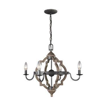 The Socorro four light mini-chandelier in stardust enhances the beauty of your home with ample light and style to match today's trends. The transitional Socorro lighting series by features a classic, barbed Quatrefoil profile - wholly updated by combining a distressed Cerused Oak finish on the decorative silhouette with the rich Stardust finish on the metal bobeches and decorative strapping to create undeniable rustic charm. While still offered in its original finish Stardust, the Socorro has been beautifully updated with our popular Washed Pine and Chrome finish to offer a modern take on this timeless industrial beauty. The collection includes a four-light mini-chandelier, medium and large six-light chandeliers, and four-light and six-light hall / foyer pendants. Incandescent candelabra base lamping.