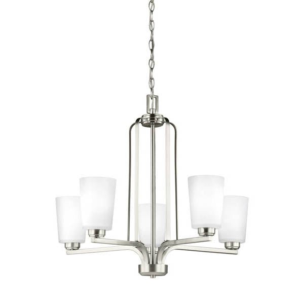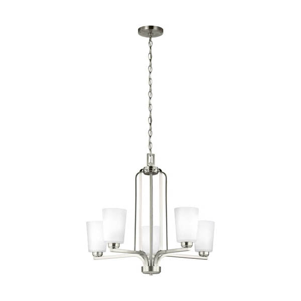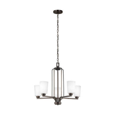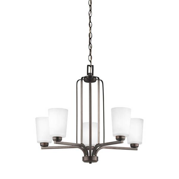 The Franport five light single tier chandelier in bronze enhances the beauty of your home with ample light and style to match today's trends. Modernist influences abound in the Franport Collection. Shades with sharp lines and simplified bases showcase the minimalist approach with a twist. Franport has fixtures for all parts of the property. Available in both Burnt Sienna and Brushed Nickel finish choices as well as Nickel for bath fixtures. With fixtures in various sizes and configurations, the Franport Collection will coordinate the same design theme across several different rooms. Its assortment includes three-, five-, nine- and fifteen-light chandeliers; and one- two-, three- and four- light bath vanity fixtures. The Franport collection pars wonderfully with Geary ceiling fixtures. Incandescent and ENERGY STAR-qualified LED lamping are available; all fixtures are California Title 24 compliant.