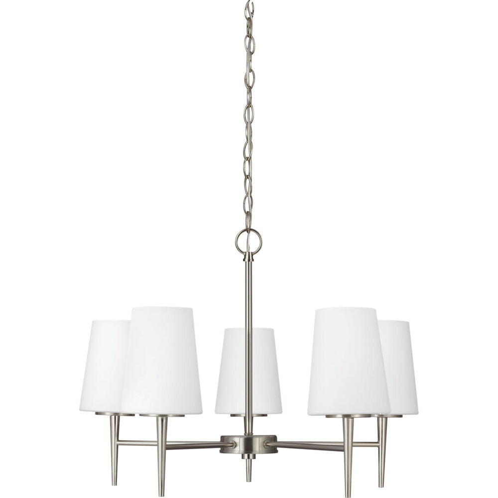 The Driscoll three light single tier chandelier is the perfect way to achieve your desired fashion or functional needs in your home. The 1960as-inspired Driscoll collection by features the clean lines of tapered stems and glass shades. Simplicity combined with sophistication creates this strikingly modern look. Offered in a Brushed Nickel finish in addition to the Chrome finish also offered for wall/bath fixtures all of which feature Etched White glass shades. The assortment includes nine-light, five-light and three-light chandeliers, a mini pendant, as well as one-light, two-light, three-light and four-light wall/bath fixtures. Both incandescent lamping and ENERGY STAR-qualified LED lamping are available; all fixtures are California Title 24 compliant.