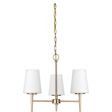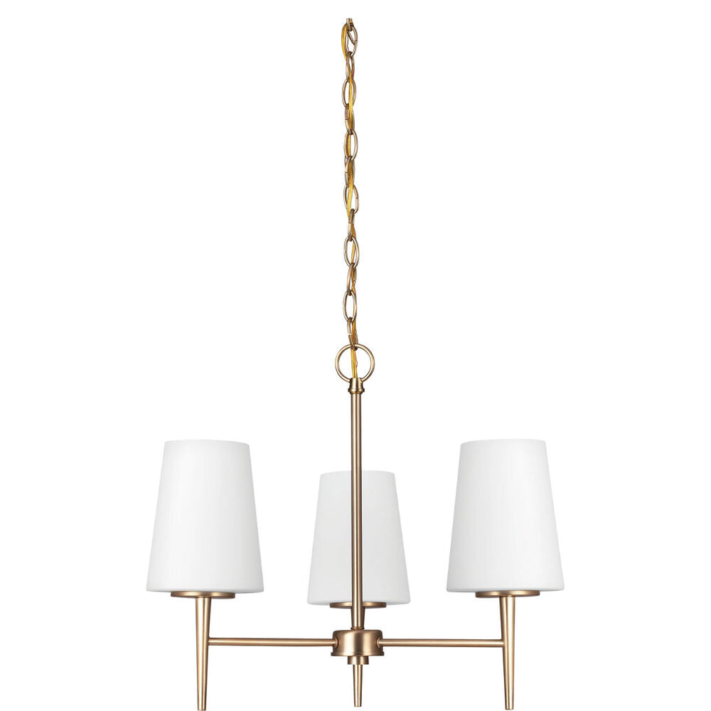 The Driscoll three light single tier chandelier in satin brass is the perfect way to achieve your desired fashion or functional needs in your home. The 1960as-inspired Driscoll collection by features the clean lines of tapered stems and glass shades. Simplicity combined with sophistication creates this strikingly modern look. Offered in a Brushed Nickel finish in addition to the Chrome finish also offered for wall/bath fixtures all of which feature Etched White glass shades. The assortment includes nine-light, five-light and three-light chandeliers, a mini pendant, as well as one-light, two-light, three-light and four-light wall/bath fixtures. Both incandescent lamping and ENERGY STAR-qualified LED lamping are available; all fixtures are California Title 24 compliant.
