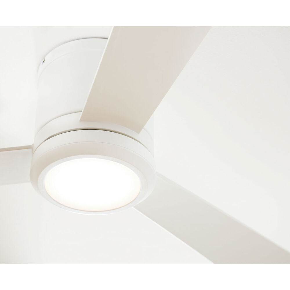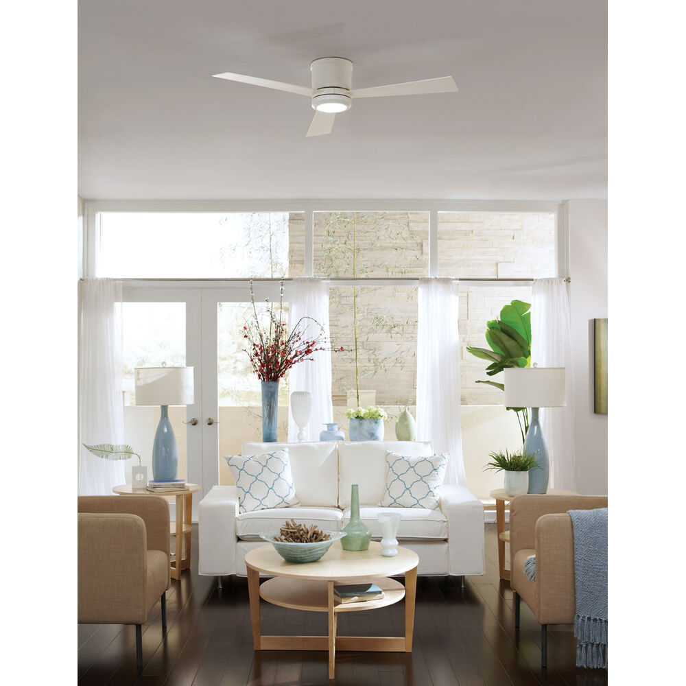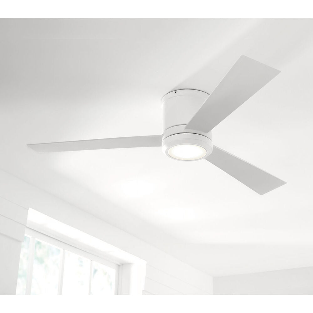 The Clarity 52 ceiling fan has a sleek, three-blade design that hugs the ceiling. It's offered in four finish combinations to suite virtually any decor. The fan's blade sweep is 52". A two-in-one remote control (combo hand-held and wall mount) with reverse and dimmer functionality is included.