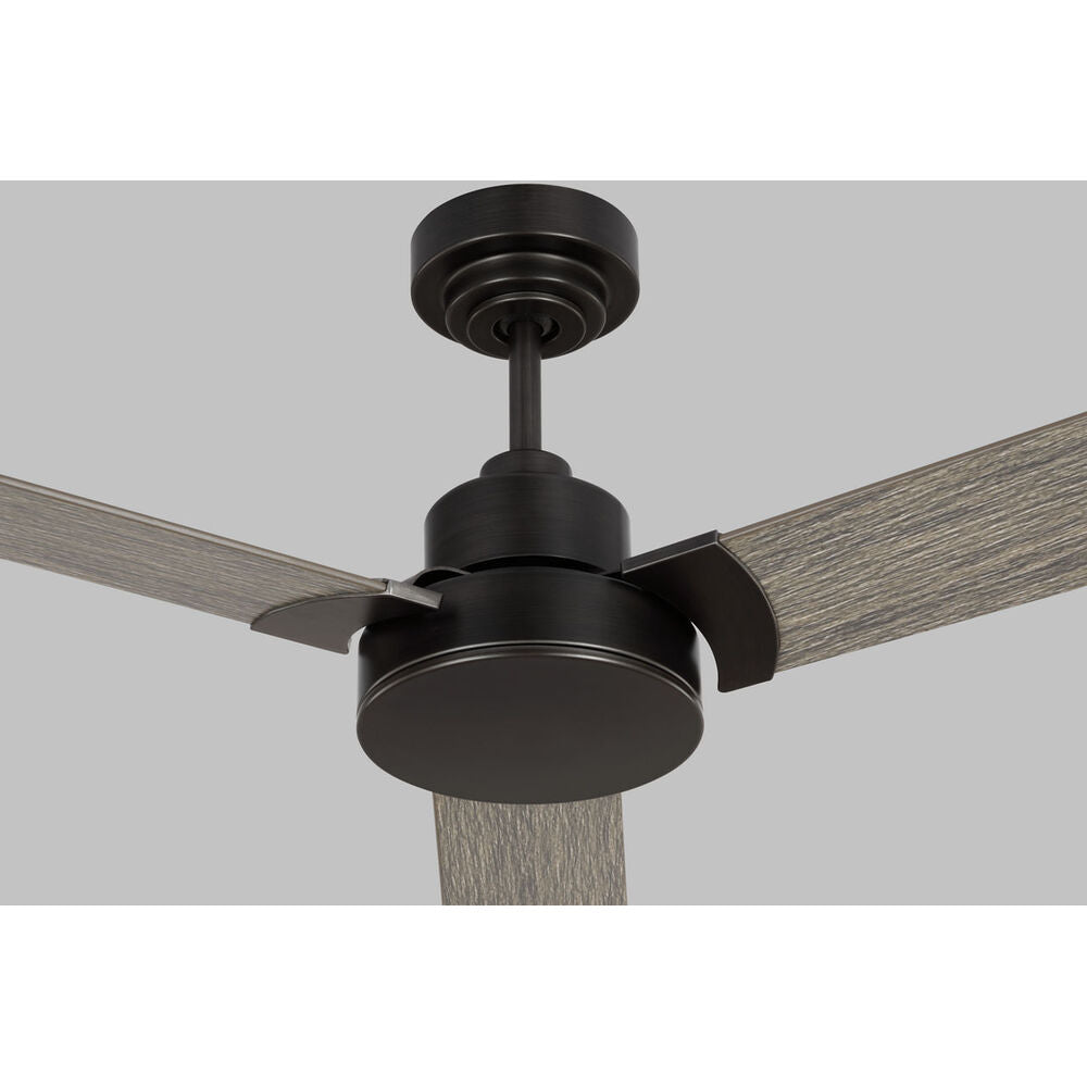 Transitional, industrial, 3 blade fan with light grey weathered blades for damp locations