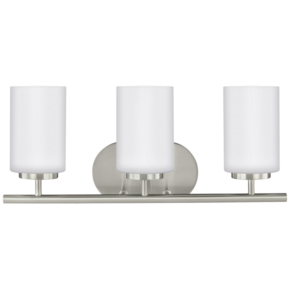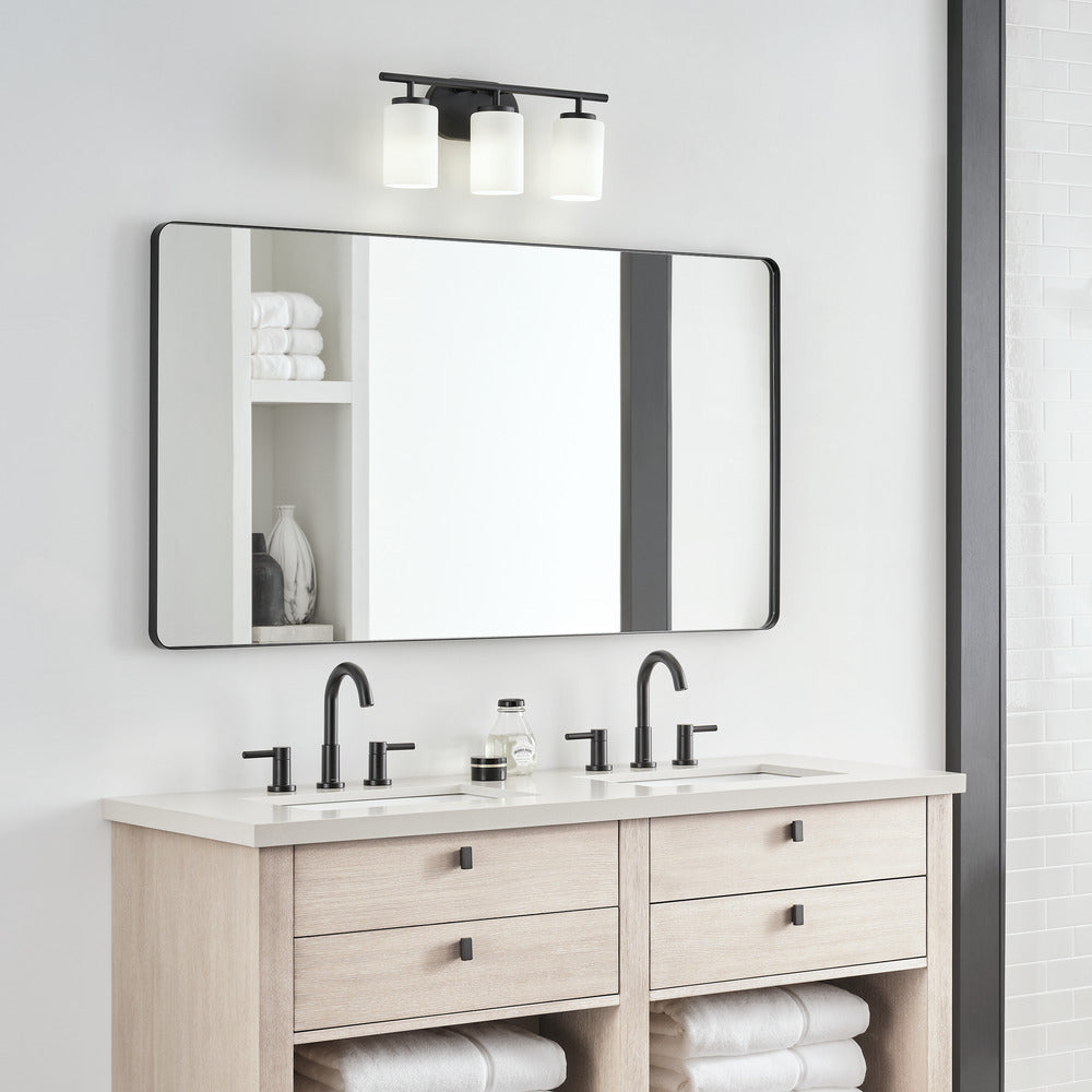 The Oslo three light vanity fixture offers shadow-free lighting in your powder room, spa, or master bath room. The Oslo lighting collection by is a sleek design, with smooth and clean lines. The Opal Etched glass adds to this collection's contemporary and minimalist character. Offered, Brushed Nickel, Burnt Sienna and textured Blacksmith finishes, the collection includes nine-, five-, and three-light chandeliers, pendants in four sizes, both flush and semi-flush ceiling fixtures, as well as one-, two-, three- and four-light wall/bath fixtures. Both incandescent lamping and ENERGY STAR-qualified LED lamping are available. All fixtures are California Title 24 compliant.