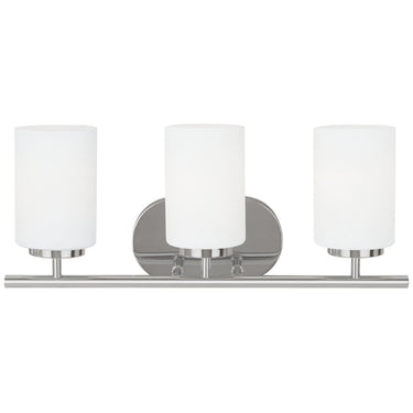 The Oslo three light vanity fixture in chrome offers shadow-free lighting in your powder room, spa, or master bath room. The Oslo lighting collection by is a sleek design, with smooth and clean lines. The Opal Etched glass adds to this collection's contemporary and minimalist character. Offered in Chrome, Brushed Nickel, Burnt Sienna and textured Blacksmith finishes, the collection includes nine-, five-, and three-light chandeliers, pendants in four sizes, both flush and semi-flush ceiling fixtures, as well as one-, two-, three- and four-light wall/bath fixtures. Both incandescent lamping and ENERGY STAR-qualified LED lamping are available. All fixtures are California Title 24 compliant.