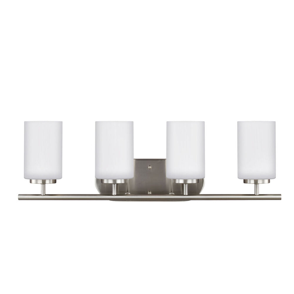 The Oslo four light vanity fixture provides abundant light for your bath vanity, while adding a layer of today's style to your interior design. The Oslo lighting collection by is a sleek design, with smooth and clean lines. The Opal Etched glass adds to this collection's contemporary and minimalist character. Offered, Brushed Nickel, Burnt Sienna and textured Blacksmith finishes, the collection includes nine-, five-, and three-light chandeliers, pendants in four sizes, both flush and semi-flush ceiling fixtures, as well as one-, two-, three- and four-light wall/bath fixtures. Both incandescent lamping and ENERGY STAR-qualified LED lamping are available. All fixtures are California Title 24 compliant.
