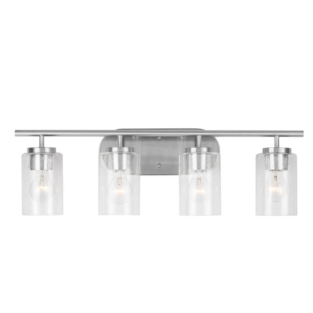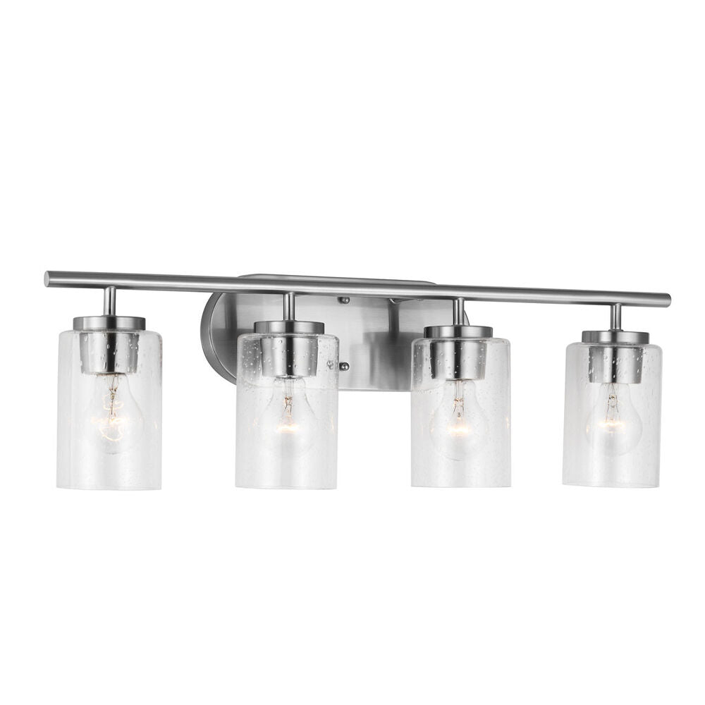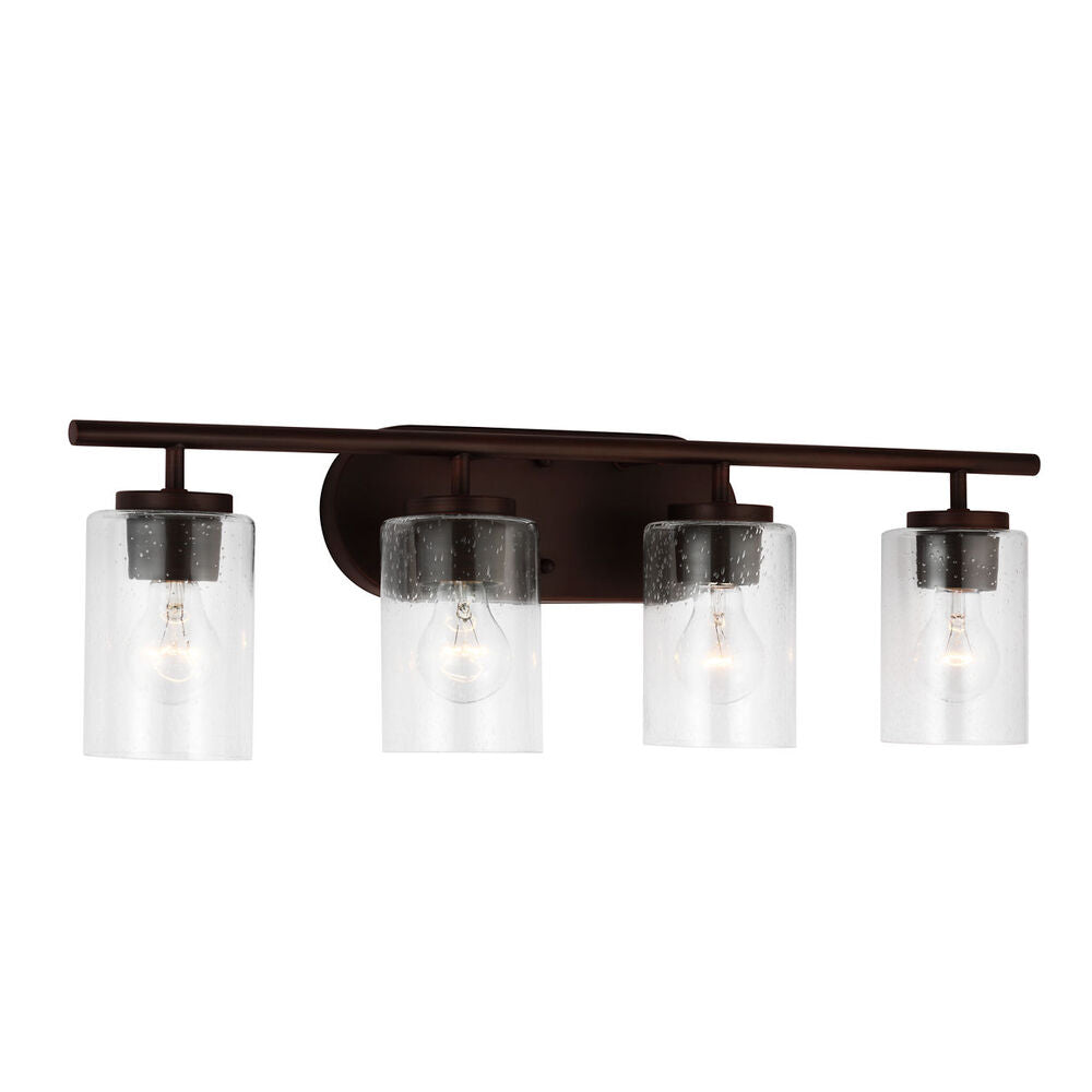 The Oslo four light vanity fixture offers shadow-free lighting in your powder room, spa, or master bath room. The Oslo lighting collection by is a sleek design, with smooth and clean lines. The Clear Seeded glass adds to this collection's contemporary and minimalist character. Offered, Brushed Nickel, Bronze and Midnight Black finishes, the collection includes nine-, five-, and three-light chandeliers, mini pendant, both flush and semi-flush ceiling fixtures, as well as one-, two-, three- and four-light wall/bath fixtures. Both incandescent lamping and ENERGY STAR-qualified LED lamping are available. All fixtures are California Title 24 compliant.
