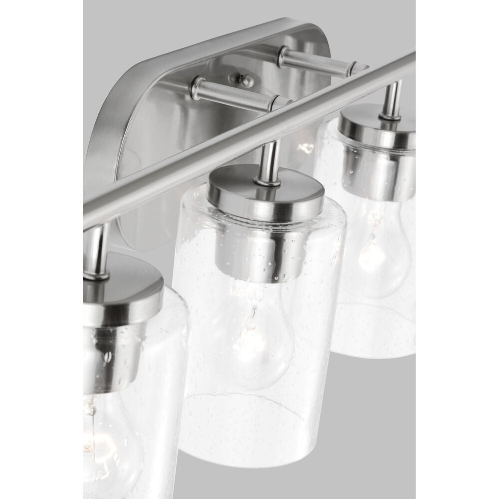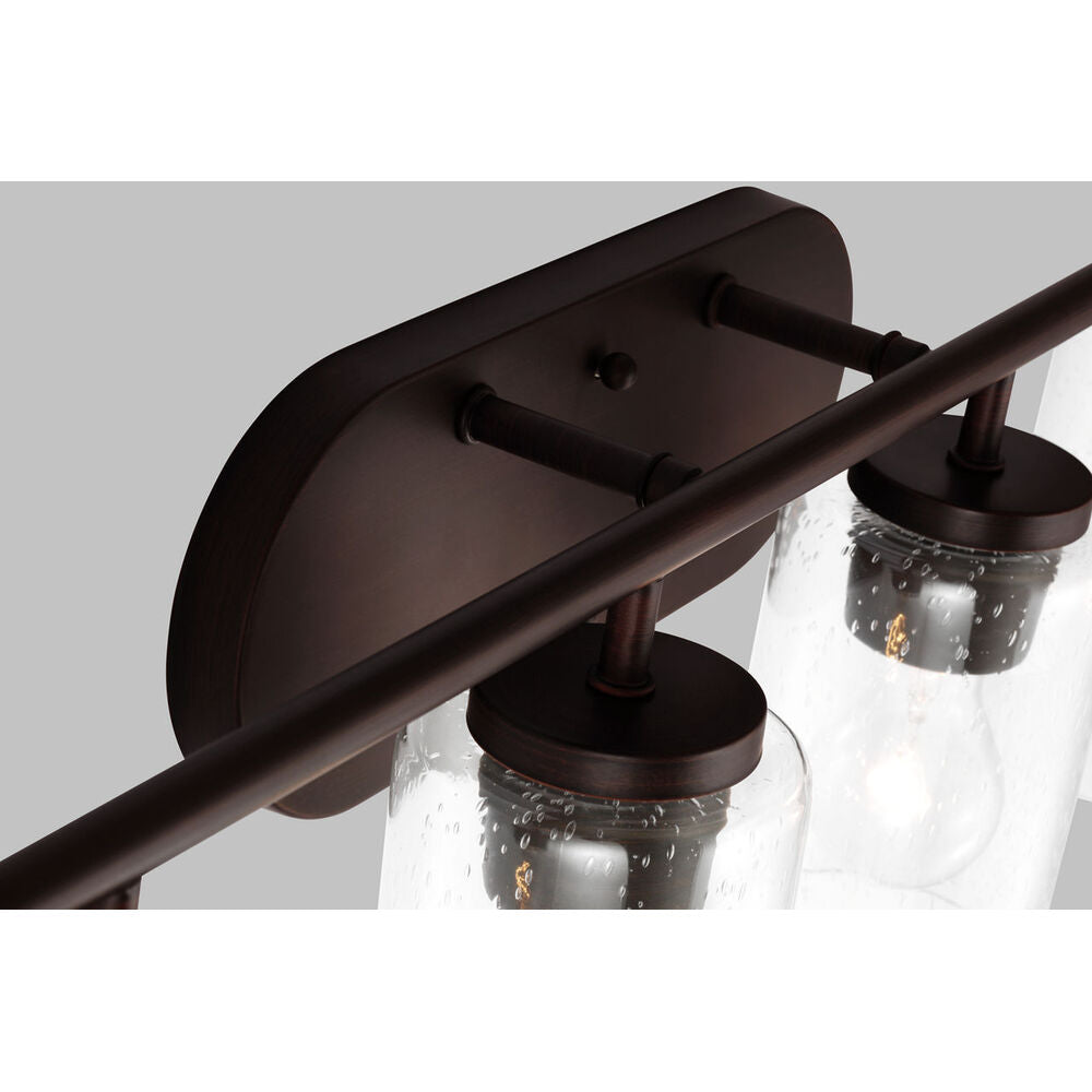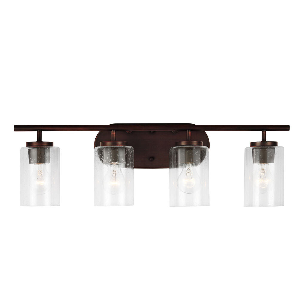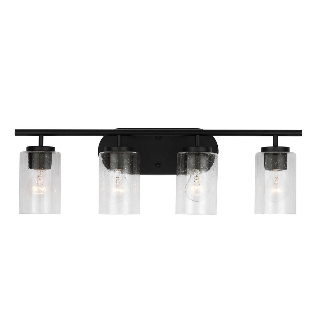 The Oslo four light vanity fixture offers shadow-free lighting in your powder room, spa, or master bath room. The Oslo lighting collection by is a sleek design, with smooth and clean lines. The Clear Seeded glass adds to this collection's contemporary and minimalist character. Offered, Brushed Nickel, Bronze and Midnight Black finishes, the collection includes nine-, five-, and three-light chandeliers, mini pendant, both flush and semi-flush ceiling fixtures, as well as one-, two-, three- and four-light wall/bath fixtures. Both incandescent lamping and ENERGY STAR-qualified LED lamping are available. All fixtures are California Title 24 compliant.