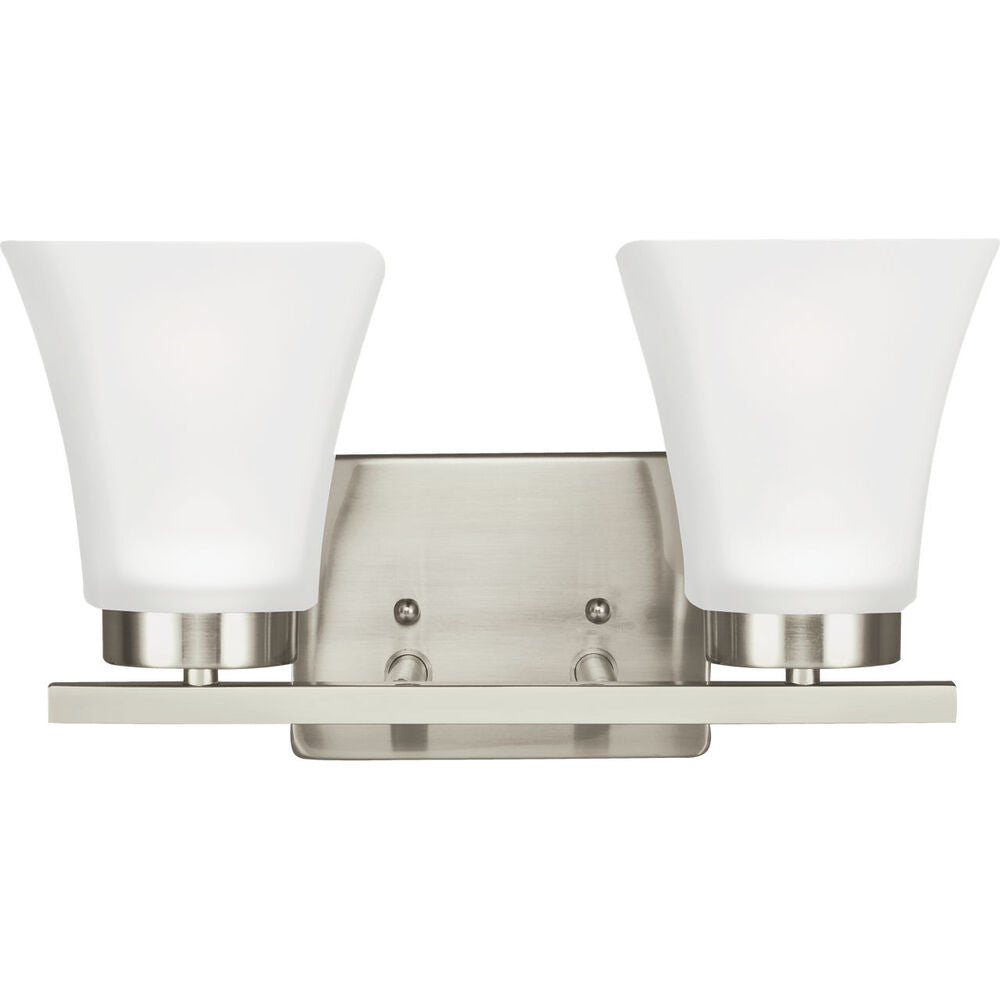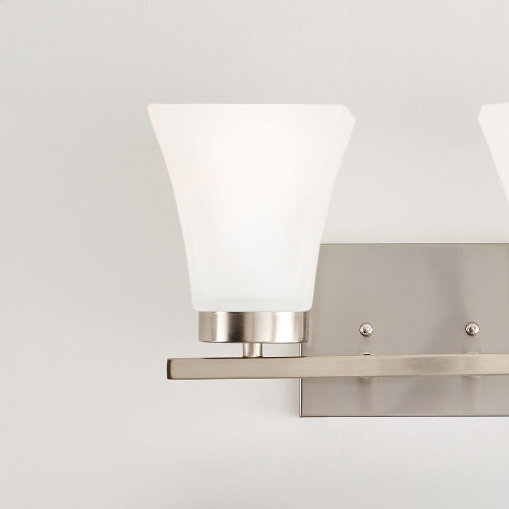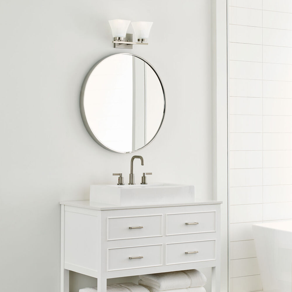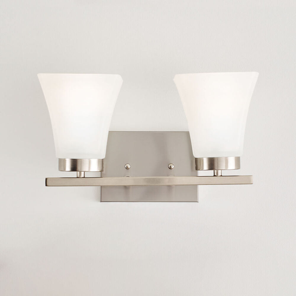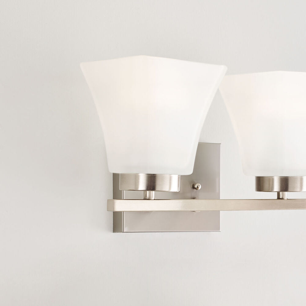 The Bayfield two light vanity fixture offers shadow-free lighting in your powder room, spa, or master bath room. The Bayfield bath collection by delivers simplicity with flair. The transitional design is a subtle combination of clean lines and flared, angular Satin Etched glass shades to bring style and warmth to the bathroom no matter the budget. Offered, Burnt Sienna and Brushed Nickel finishes, the bath lighting collection offers one-light, two-light, three-light and four-light vanity fixtures. Both incandescent lamping and ENERGY STAR-qualified LED lamping are available; all fixtures are California Title 24 compliant.