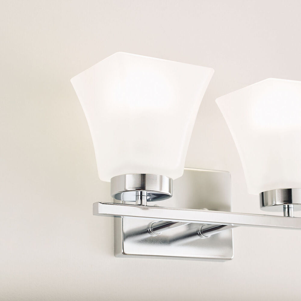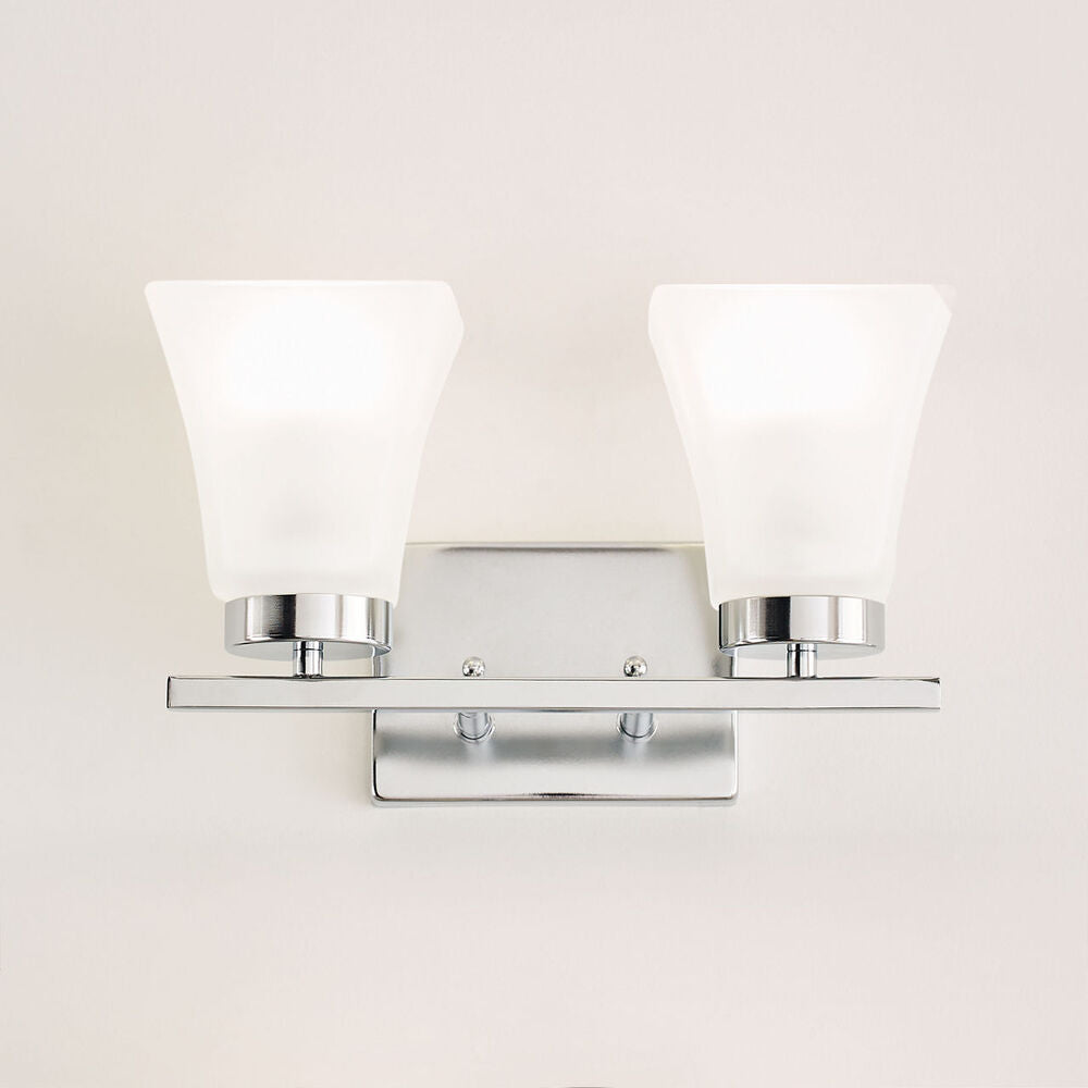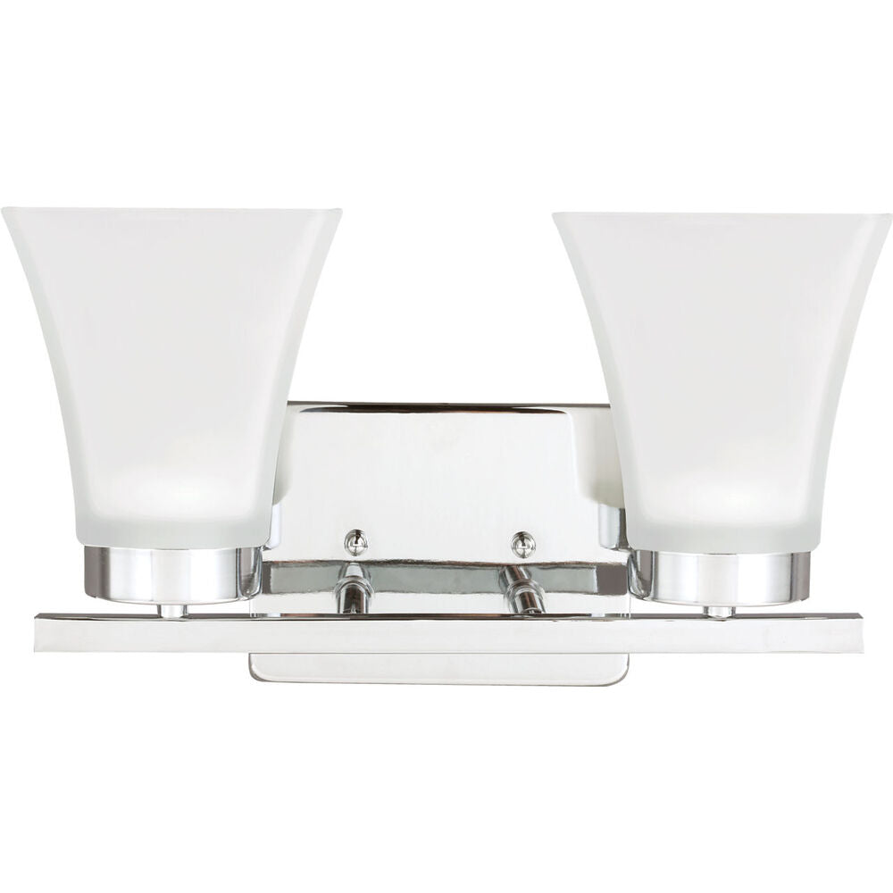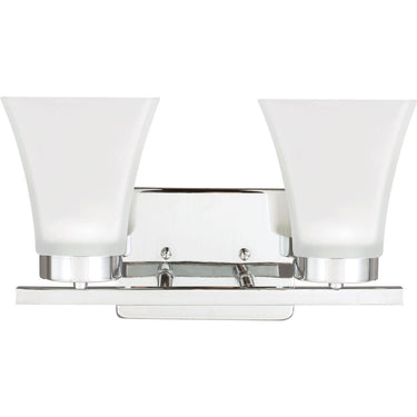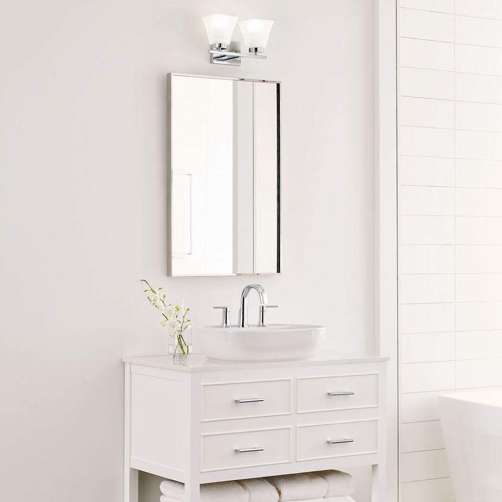 The Bayfield two light vanity fixture in chrome offers shadow-free lighting in your powder room, spa, or master bath room. The Bayfield bath collection by delivers simplicity with flair. The transitional design is a subtle combination of clean lines and flared, angular Satin Etched glass shades to bring style and warmth to the bathroom no matter the budget. Offered in Chrome, Burnt Sienna and Brushed Nickel finishes, the bath lighting collection offers one-light, two-light, three-light and four-light vanity fixtures. Both incandescent lamping and ENERGY STAR-qualified LED lamping are available; all fixtures are California Title 24 compliant.