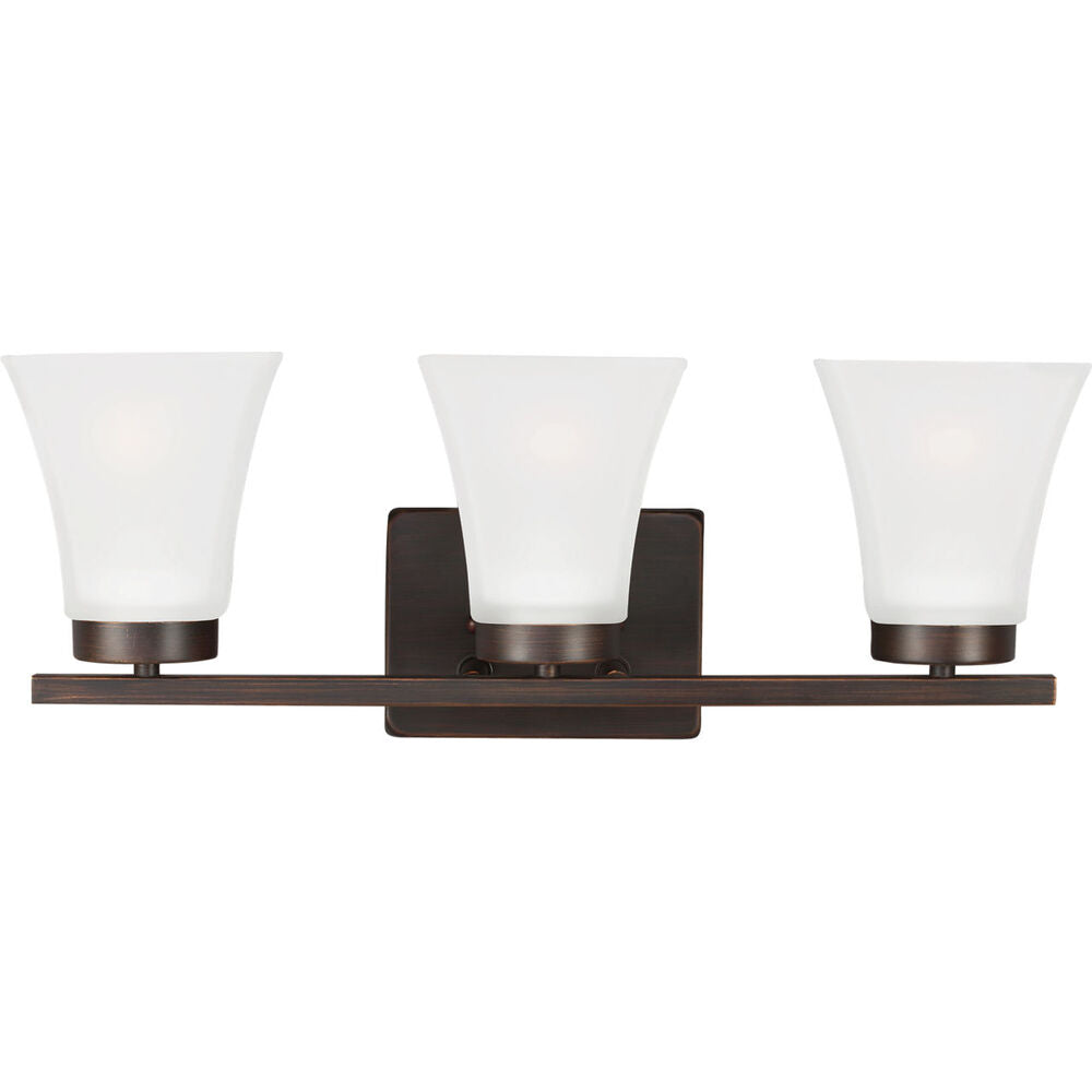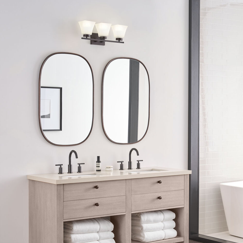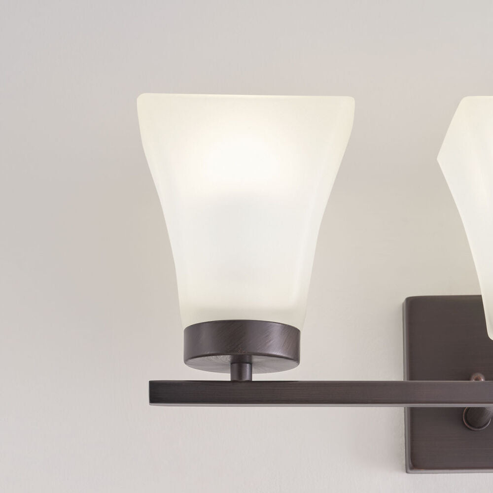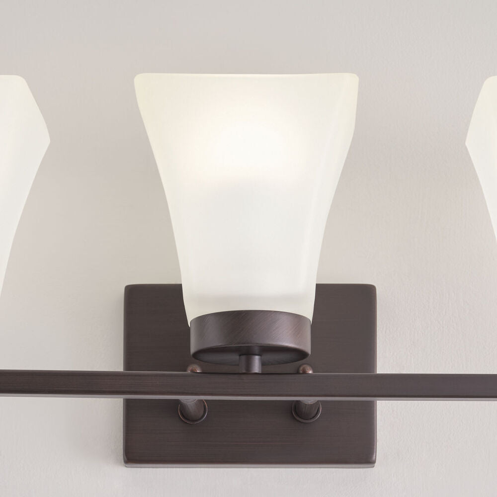 The Bayfield three light vanity fixture offers shadow-free lighting in your powder room, spa, or master bath room. The Bayfield bath collection by delivers simplicity with flair. The transitional design is a subtle combination of clean lines and flared, angular Satin Etched glass shades to bring style and warmth to the bathroom no matter the budget. Offered, Burnt Sienna and Brushed Nickel finishes, the bath lighting collection offers one-light, two-light, three-light and four-light vanity fixtures. Both incandescent lamping and ENERGY STAR-qualified LED lamping are available; all fixtures are California Title 24 compliant.