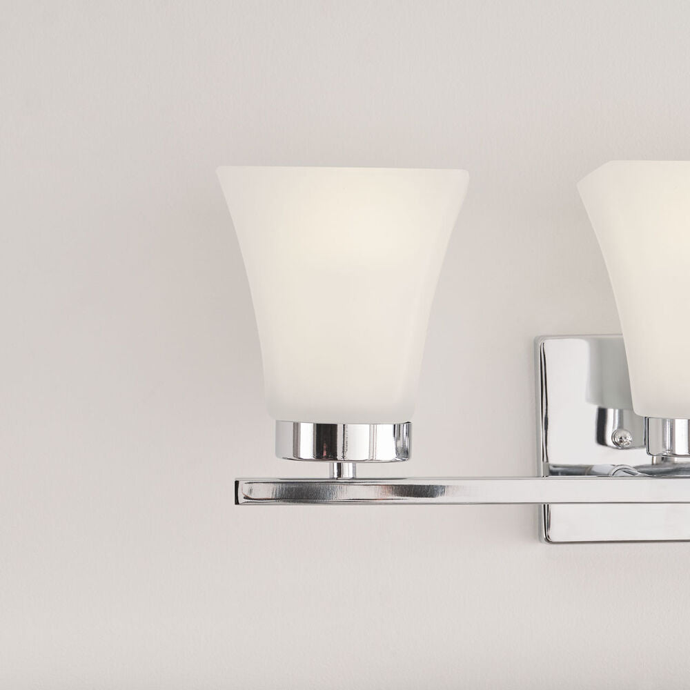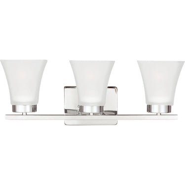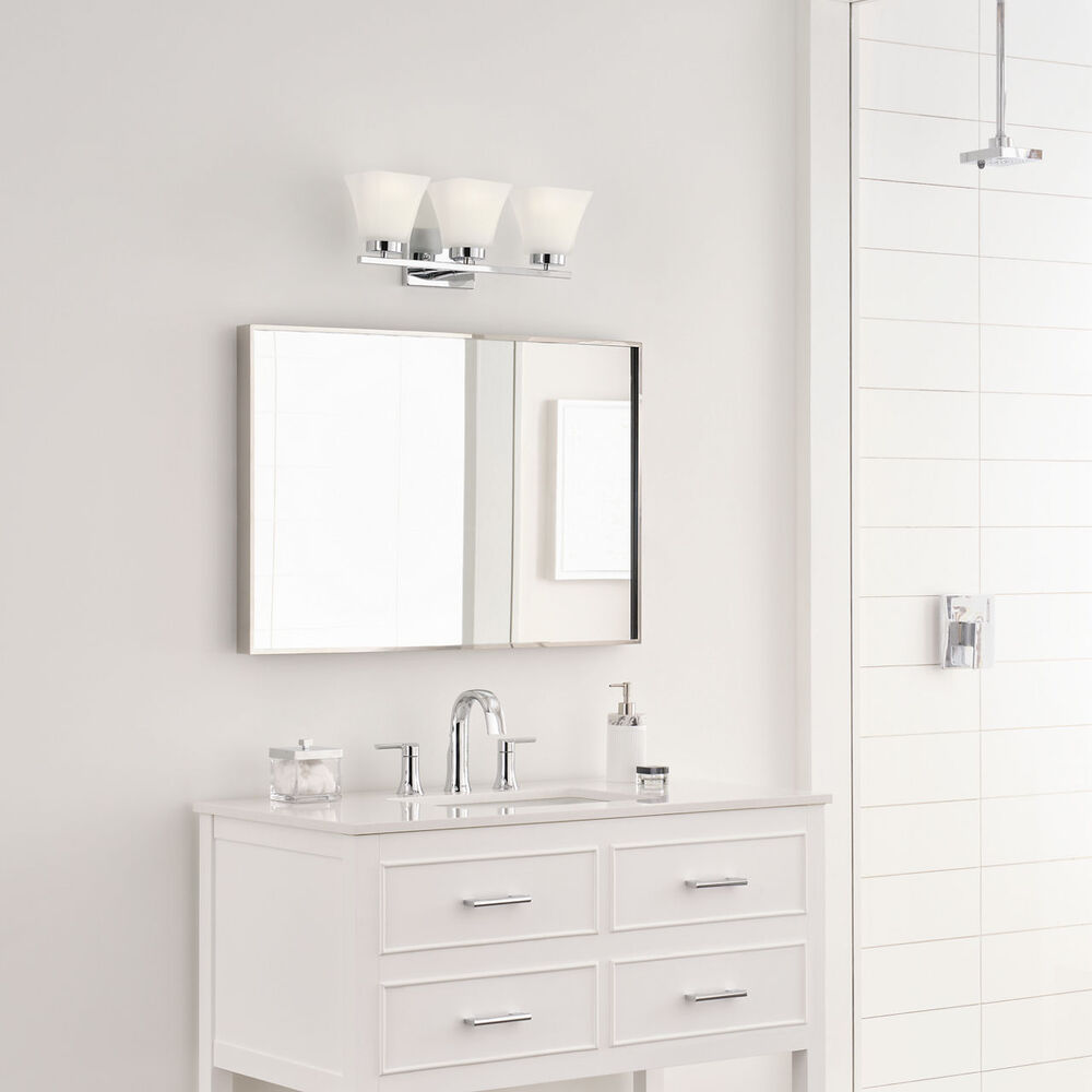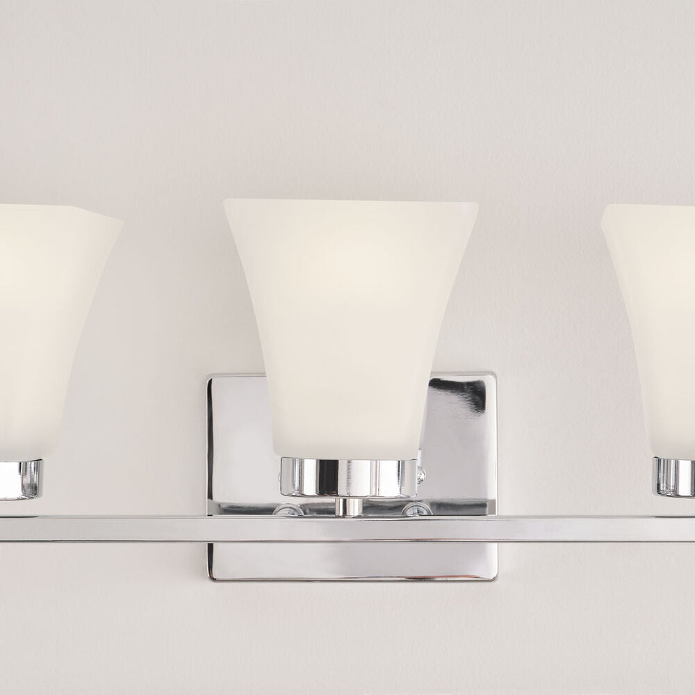 The Bayfield three light vanity fixture in chrome offers shadow-free lighting in your powder room, spa, or master bath room. The Bayfield bath collection by delivers simplicity with flair. The transitional design is a subtle combination of clean lines and flared, angular Satin Etched glass shades to bring style and warmth to the bathroom no matter the budget. Offered in Chrome, Burnt Sienna and Brushed Nickel finishes, the bath lighting collection offers one-light, two-light, three-light and four-light vanity fixtures. Both incandescent lamping and ENERGY STAR-qualified LED lamping are available; all fixtures are California Title 24 compliant.