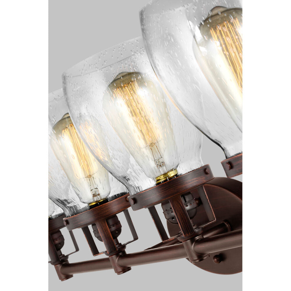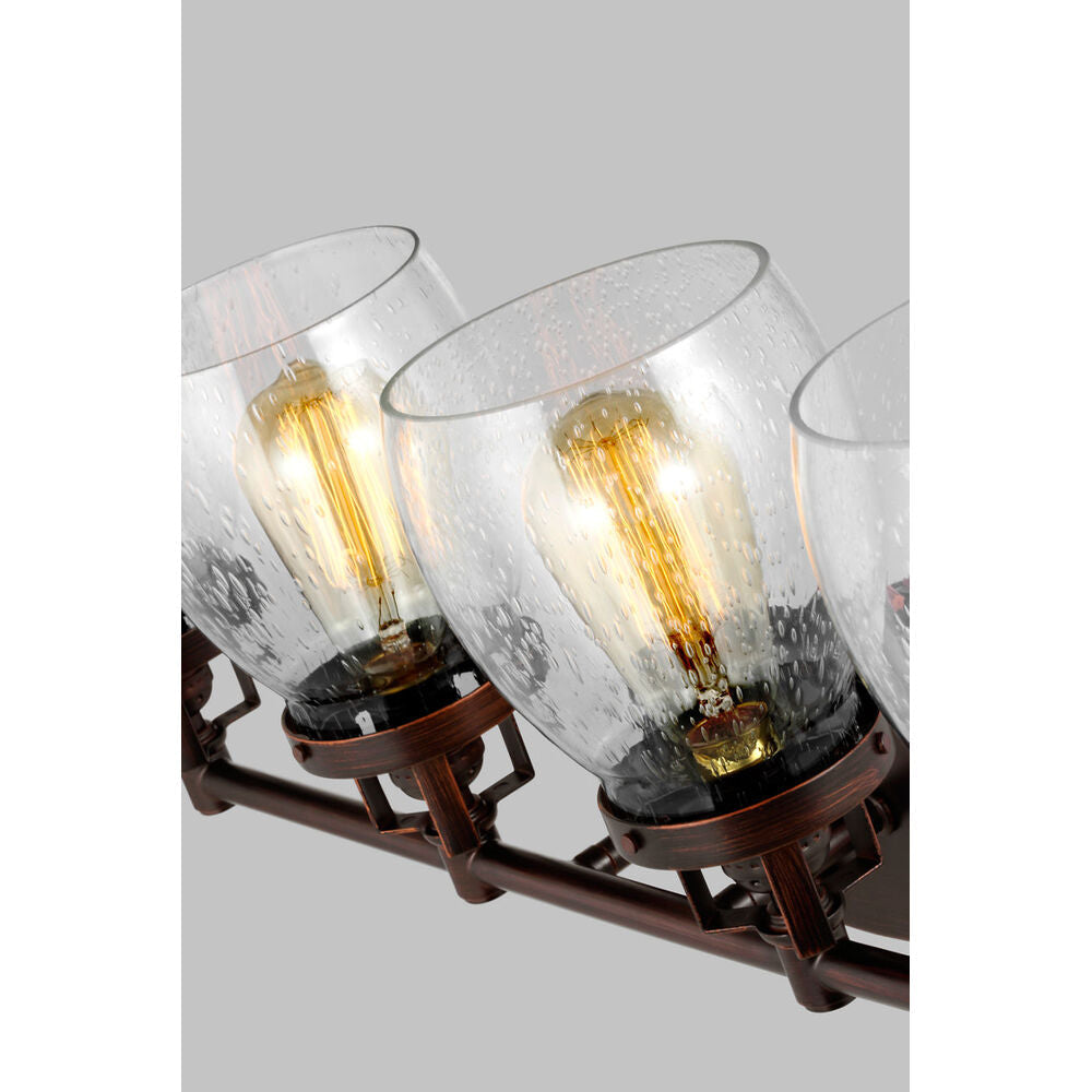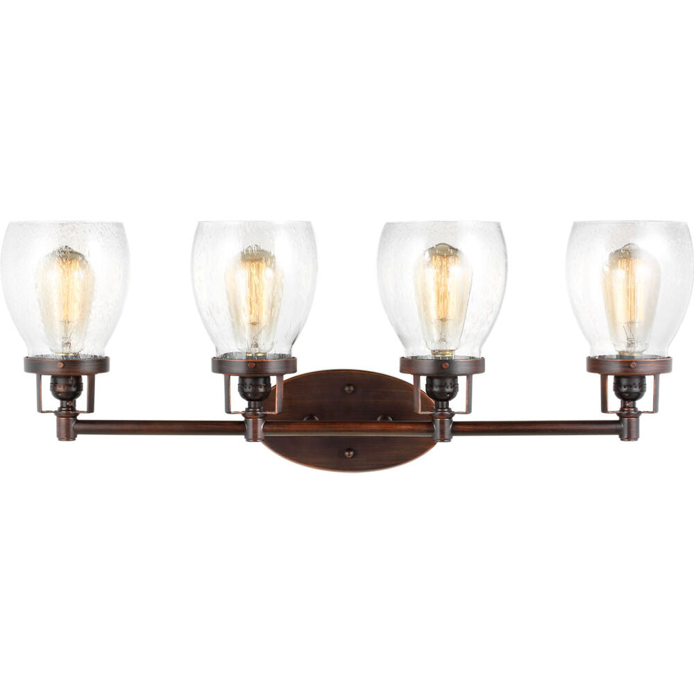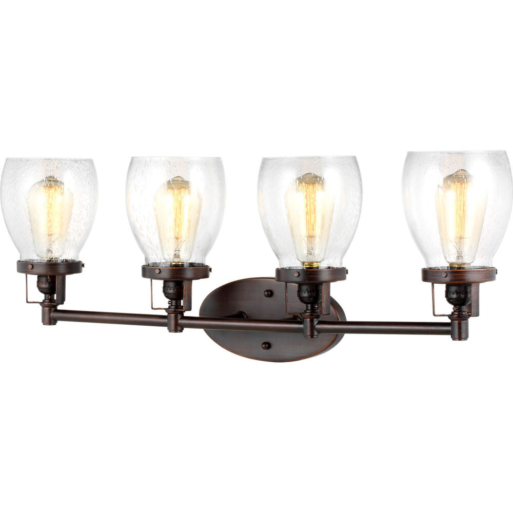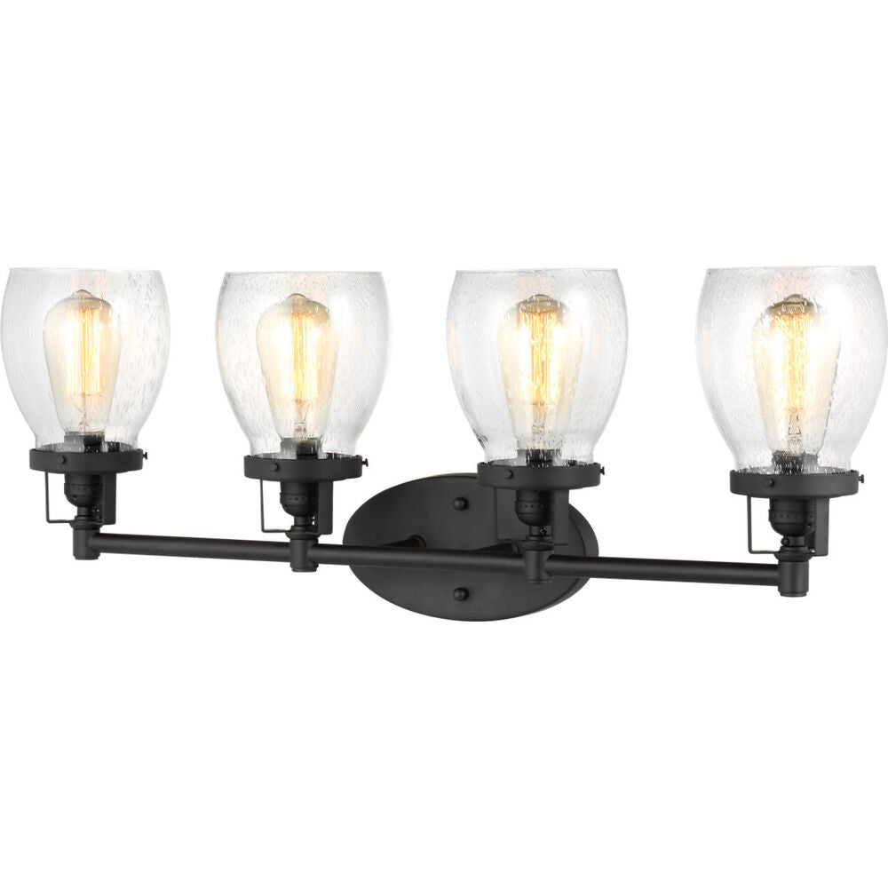 The Belton four light vanity fixture provides abundant light for your bath vanity, while adding a layer of today's style to your interior design. Influenced by the vintage industrial designs of early 20th Century America, the transitional Belton lighting collection has seeded glass shades and Midnight Black finish, adding a layer of retro design to the warm look.