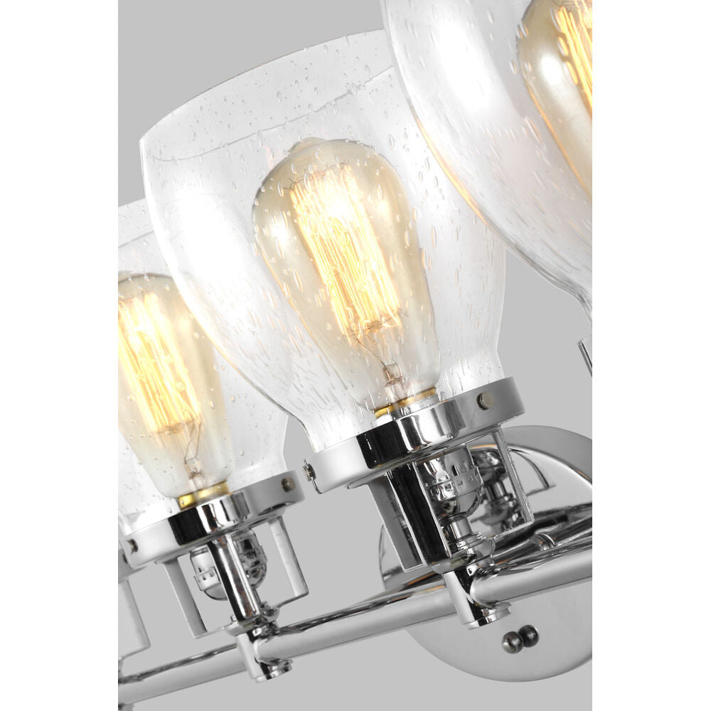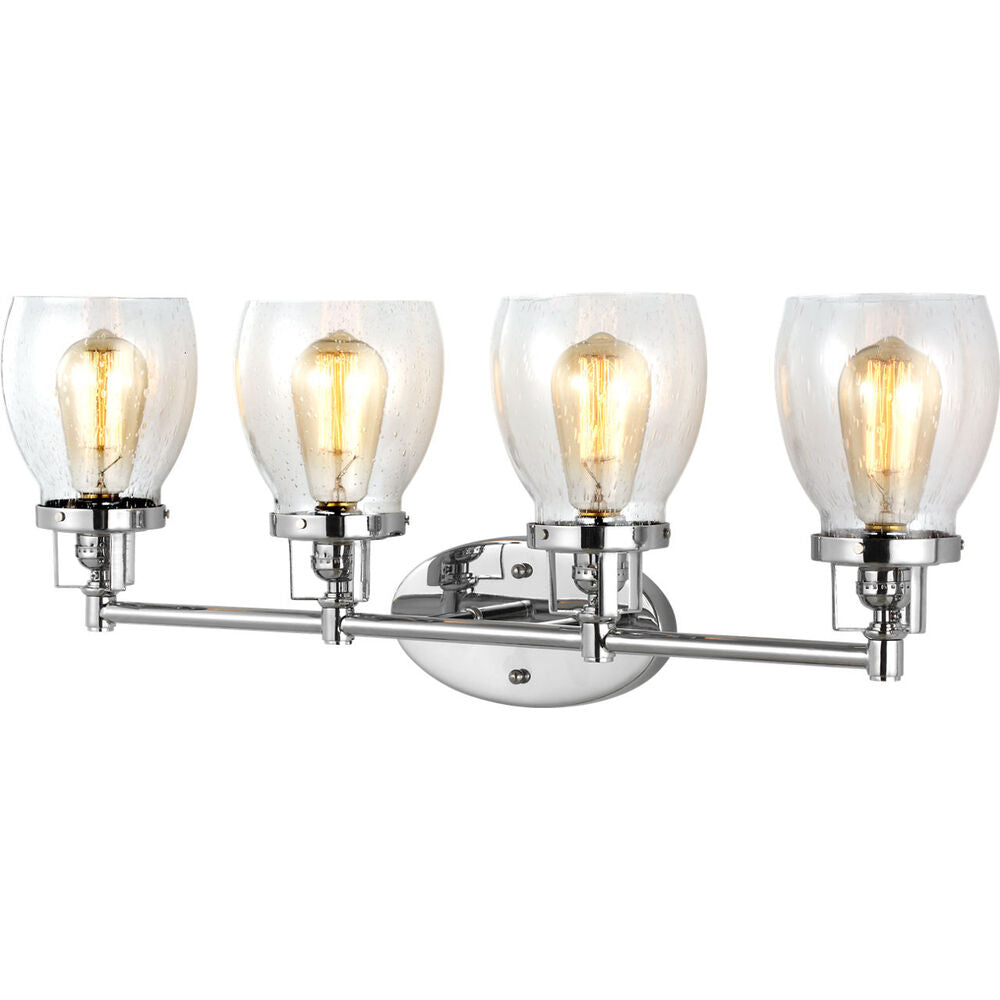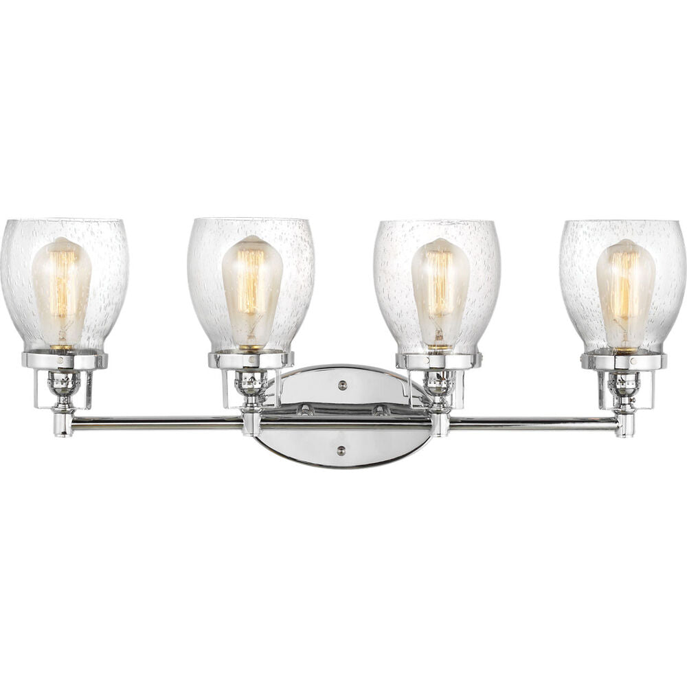 The Belton four light vanity fixture in chrome provides abundant light for your bath vanity, while adding a layer of today's style to your interior design. Influenced by the vintage industrial designs of early 20th Century America, the transitional Belton lighting collection has seeded glass shades and Midnight Black finish, adding a layer of retro design to the warm look.