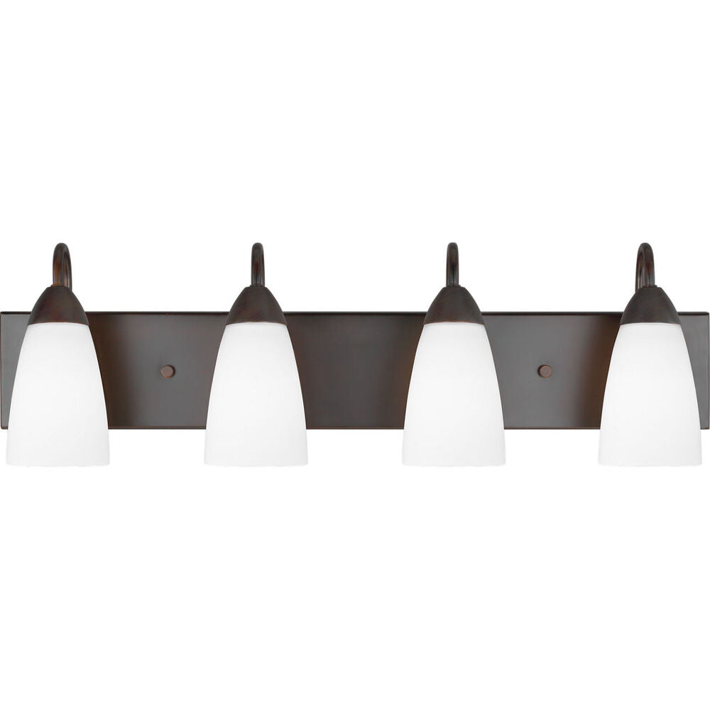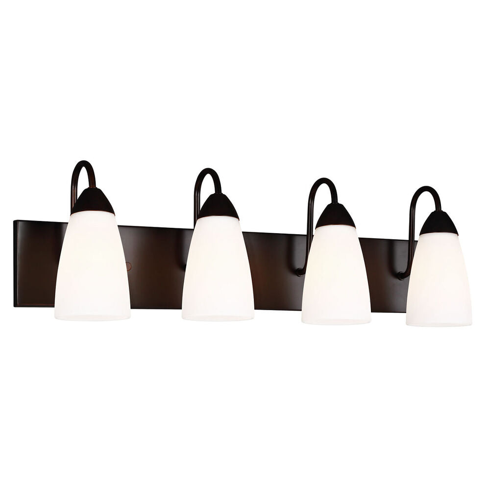 The Seville four light vanity fixture offers shadow-free lighting in your powder room, spa, or master bath room. The Seville collection represents commitment to high style at a sharp price. The modernist design is epitomized by the teardrop curves in the arms tipped by Etched glass diffusors throughout the chandeliers and bath fixtures. The collection offers a "whole home" lighting solution in every imaginable category. The assortment includes nine-light, five-light, and three-light chandeliers (either with up-light or down-light), pendants in four sizes as well as one-light, two-light, three-light , four-light and five-light wall/bath fixtures. Install a stylish and elegant addition to any room in the house. Seville is offered and Burnt Sienna finishes.