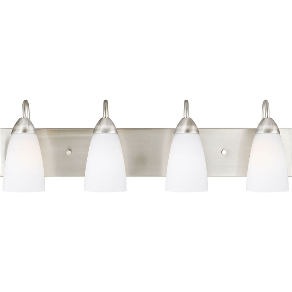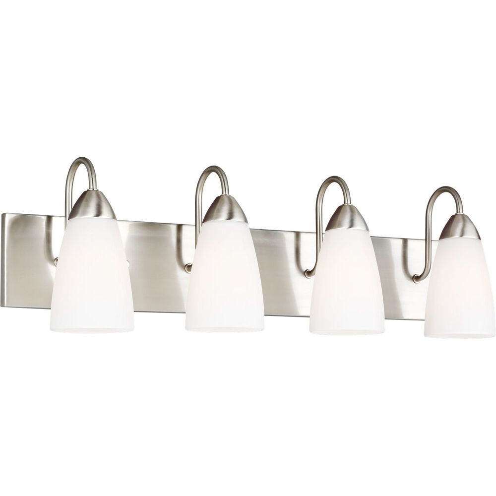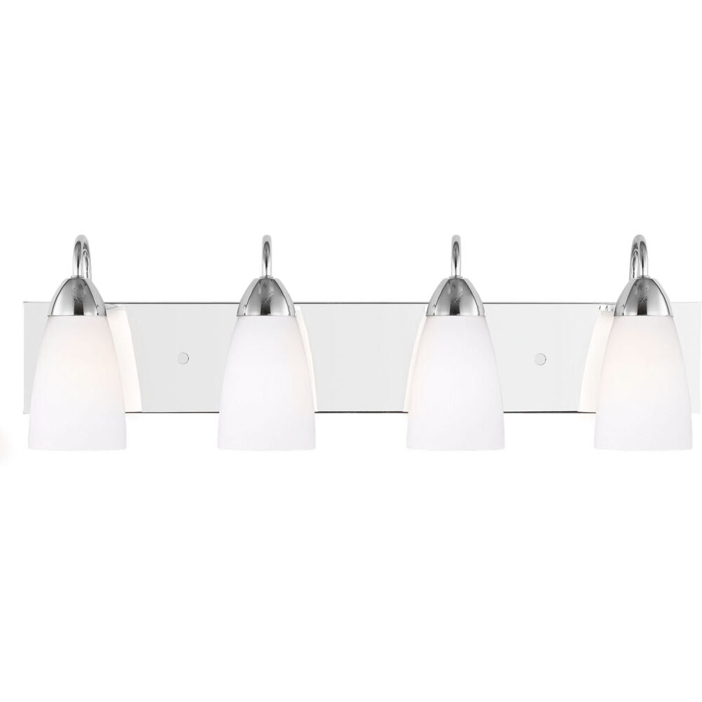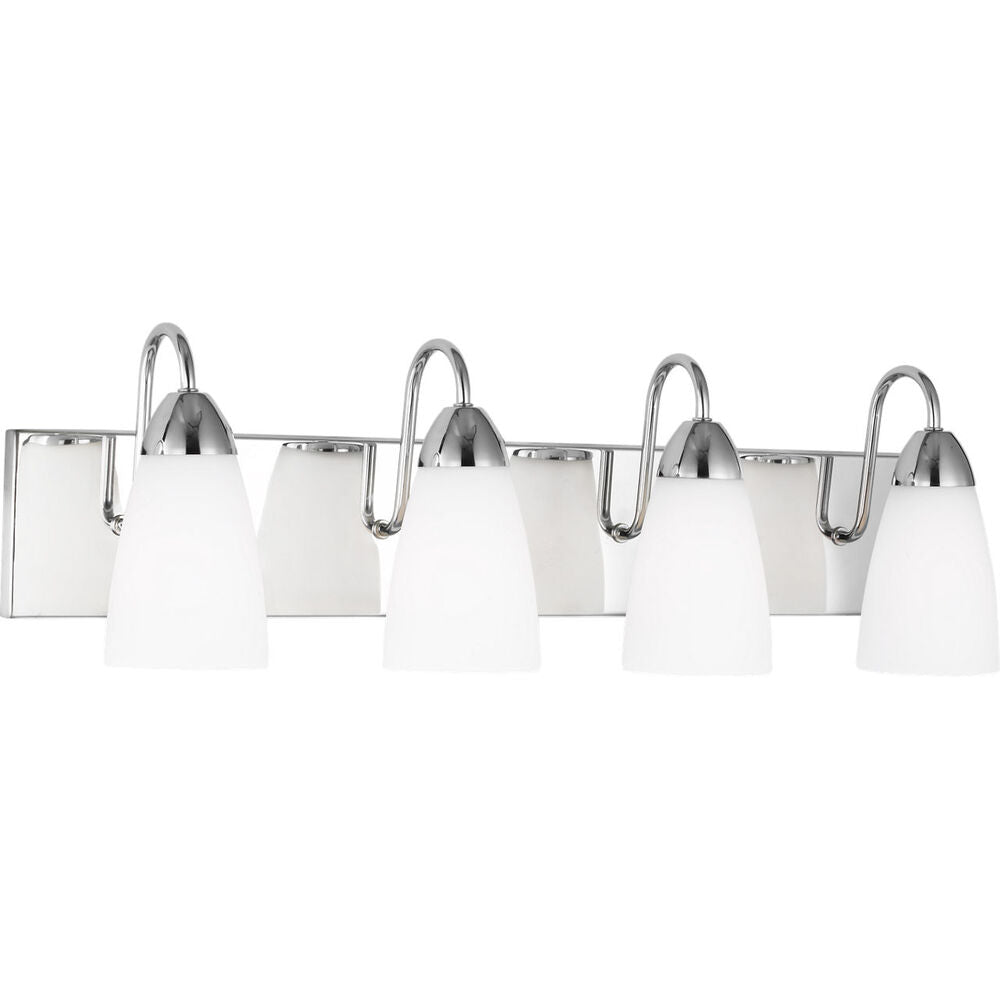 The Seville four light vanity fixture in chrome offers shadow-free lighting in your powder room, spa, or master bath room. The Seville collection represents commitment to high style at a sharp price. The modernist design is epitomized by the teardrop curves in the arms tipped by Etched glass diffusors throughout the chandeliers and bath fixtures. The collection offers a "whole home" lighting solution in every imaginable category. The assortment includes nine-light, five-light, and three-light chandeliers (either with up-light or down-light), pendants in four sizes as well as one-light, two-light, three-light , four-light and five-light wall/bath fixtures. Install a stylish and elegant addition to any room in the house. Seville is offered in Brushed Nickel and Burnt Sienna finishes.