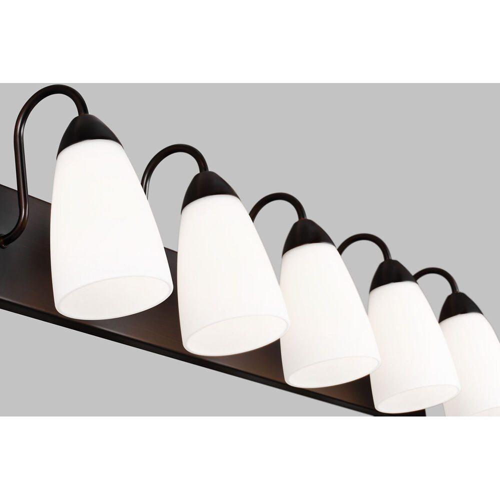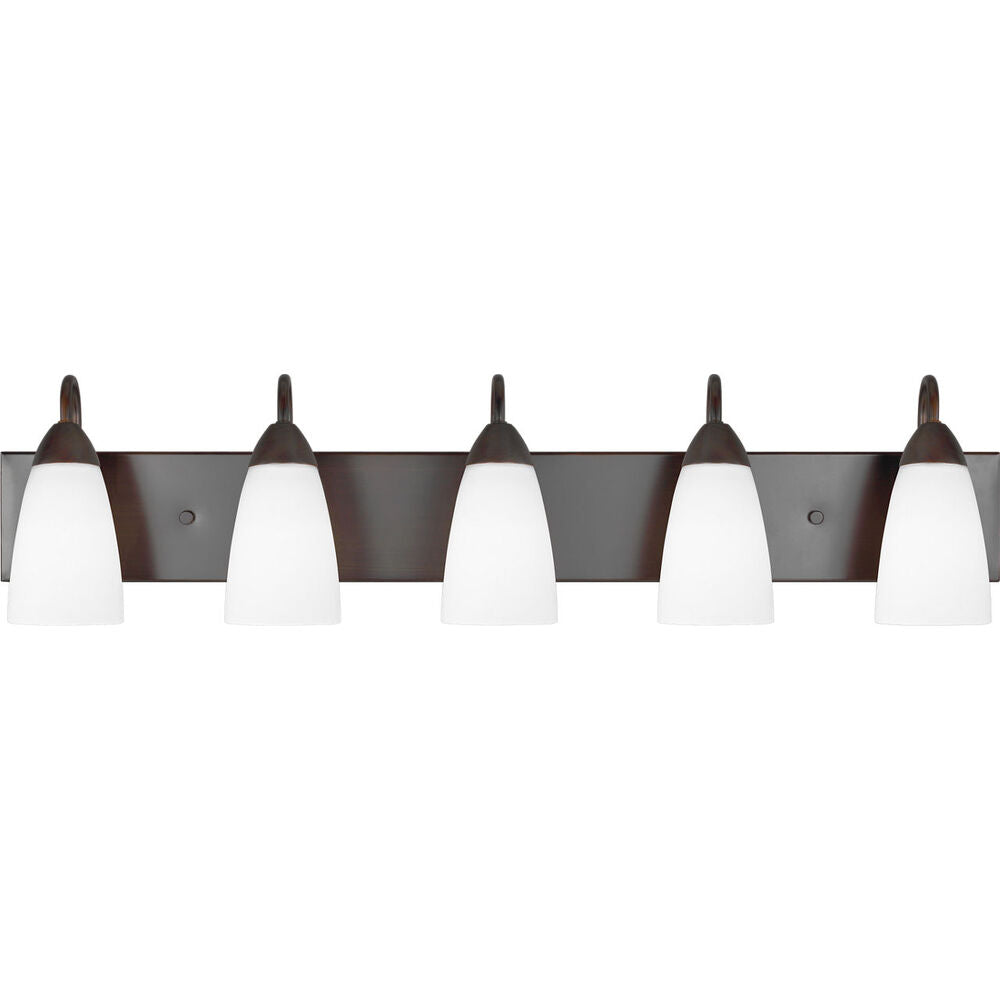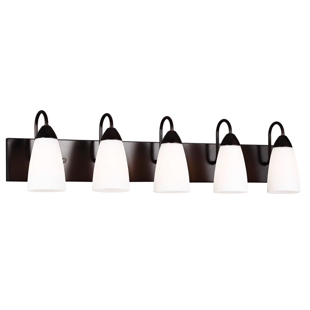 The Seville five light vanity fixture provides abundant light for your bath vanity, while adding a layer of today's style to your interior design. The Seville collection represents commitment to high style at a sharp price. The modernist design is epitomized by the teardrop curves in the arms tipped by Etched glass diffusors throughout the chandeliers and bath fixtures. The collection offers a "whole home" lighting solution in every imaginable category. The assortment includes nine-light, five-light, and three-light chandeliers (either with up-light or down-light), pendants in four sizes as well as one-light, two-light, three-light , four-light and five-light wall/bath fixtures. Install a stylish and elegant addition to any room in the house. Seville is offered and Burnt Sienna finishes.