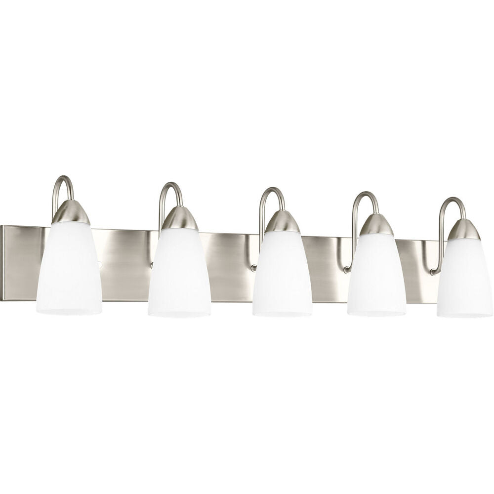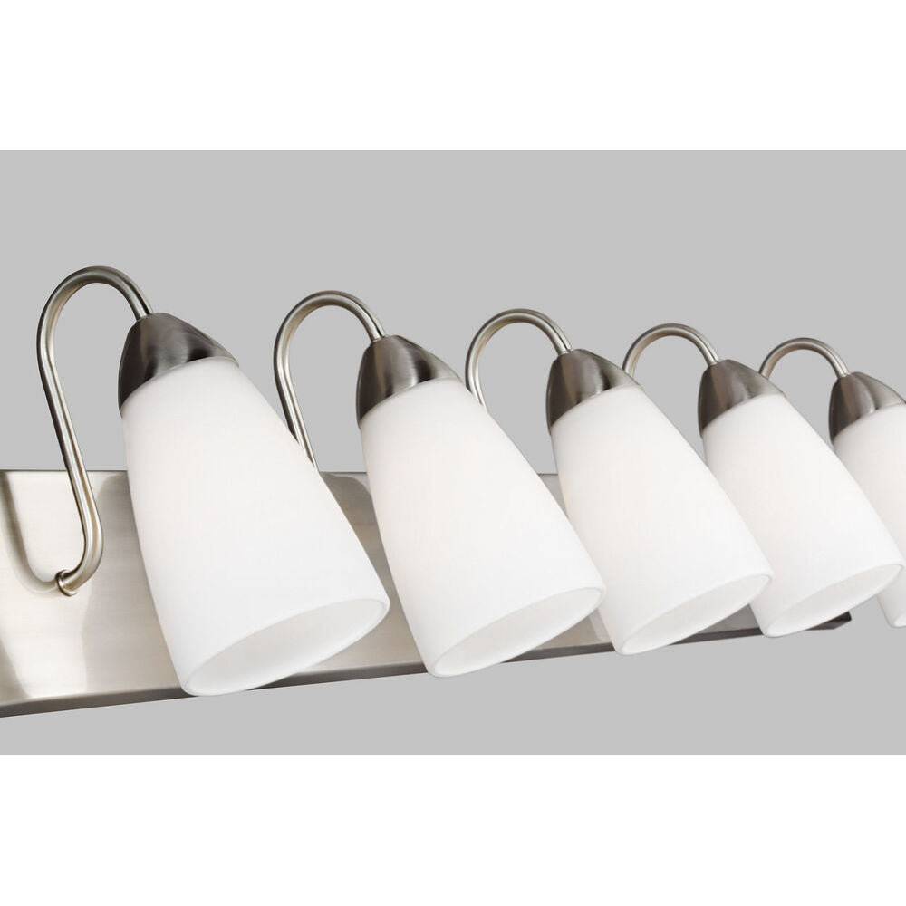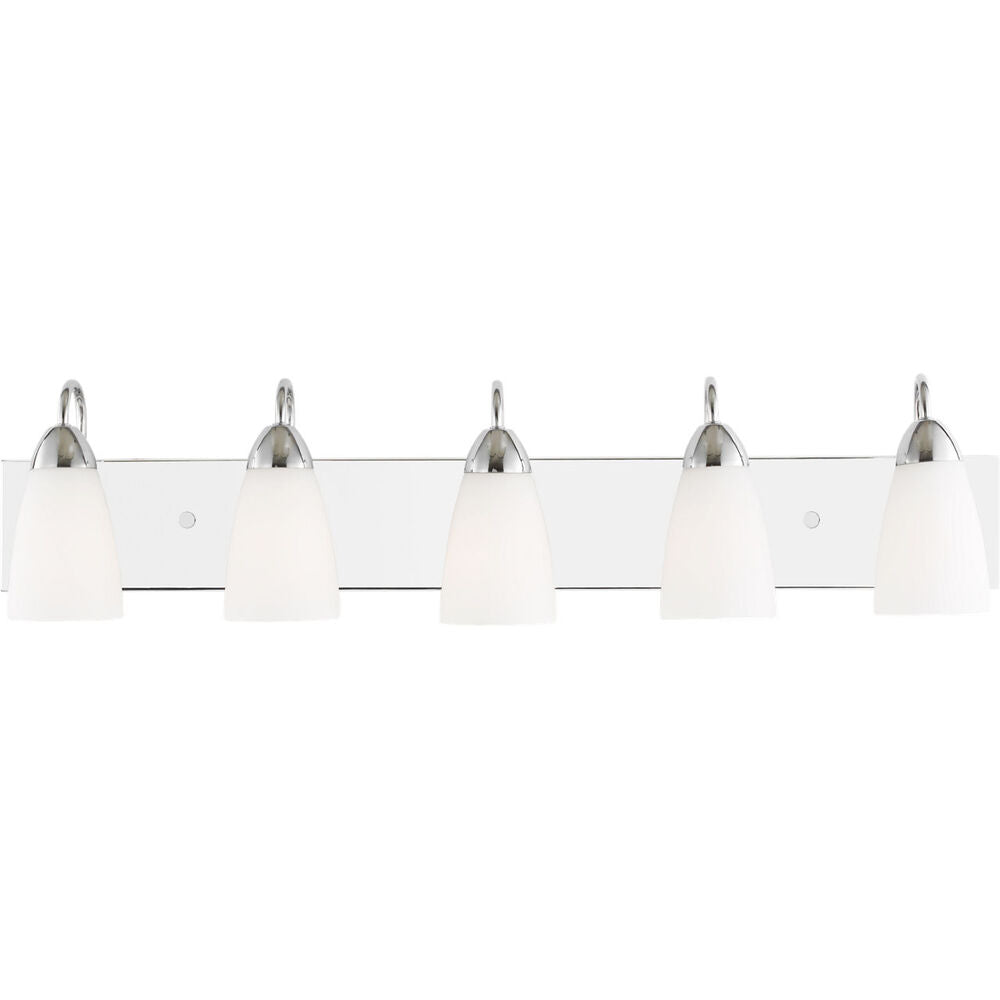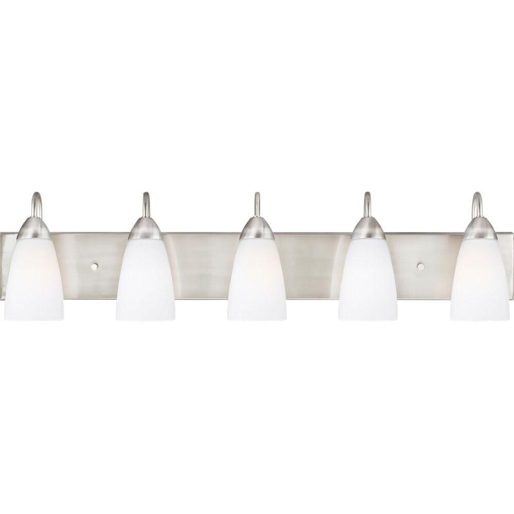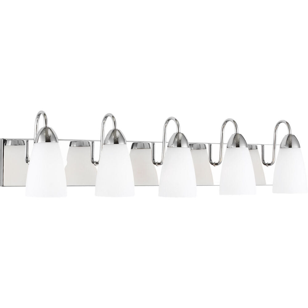 The Seville five light vanity fixture in chrome provides abundant light for your bath vanity, while adding a layer of today's style to your interior design. The Seville collection represents commitment to high style at a sharp price. The modernist design is epitomized by the teardrop curves in the arms tipped by Etched glass diffusors throughout the chandeliers and bath fixtures. The collection offers a "whole home" lighting solution in every imaginable category. The assortment includes nine-light, five-light, and three-light chandeliers (either with up-light or down-light), pendants in four sizes as well as one-light, two-light, three-light , four-light and five-light wall/bath fixtures. Install a stylish and elegant addition to any room in the house. Seville is offered in Brushed Nickel and Burnt Sienna finishes.