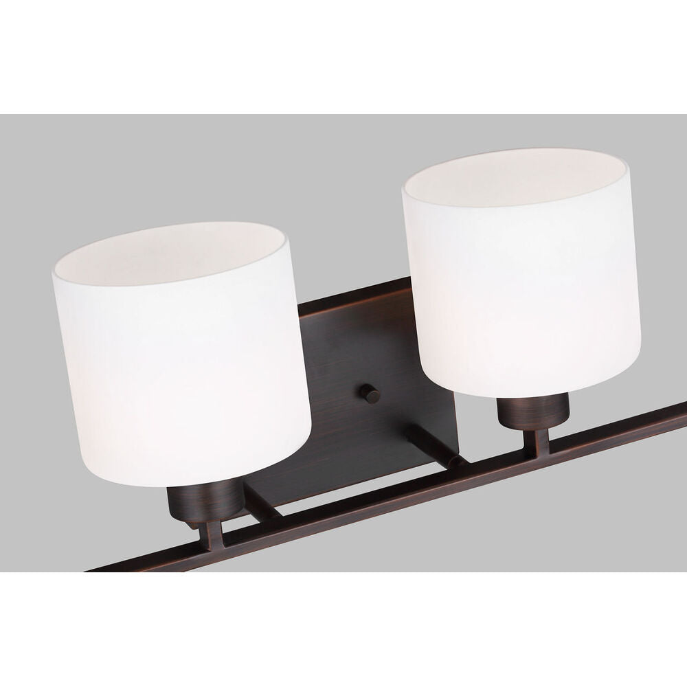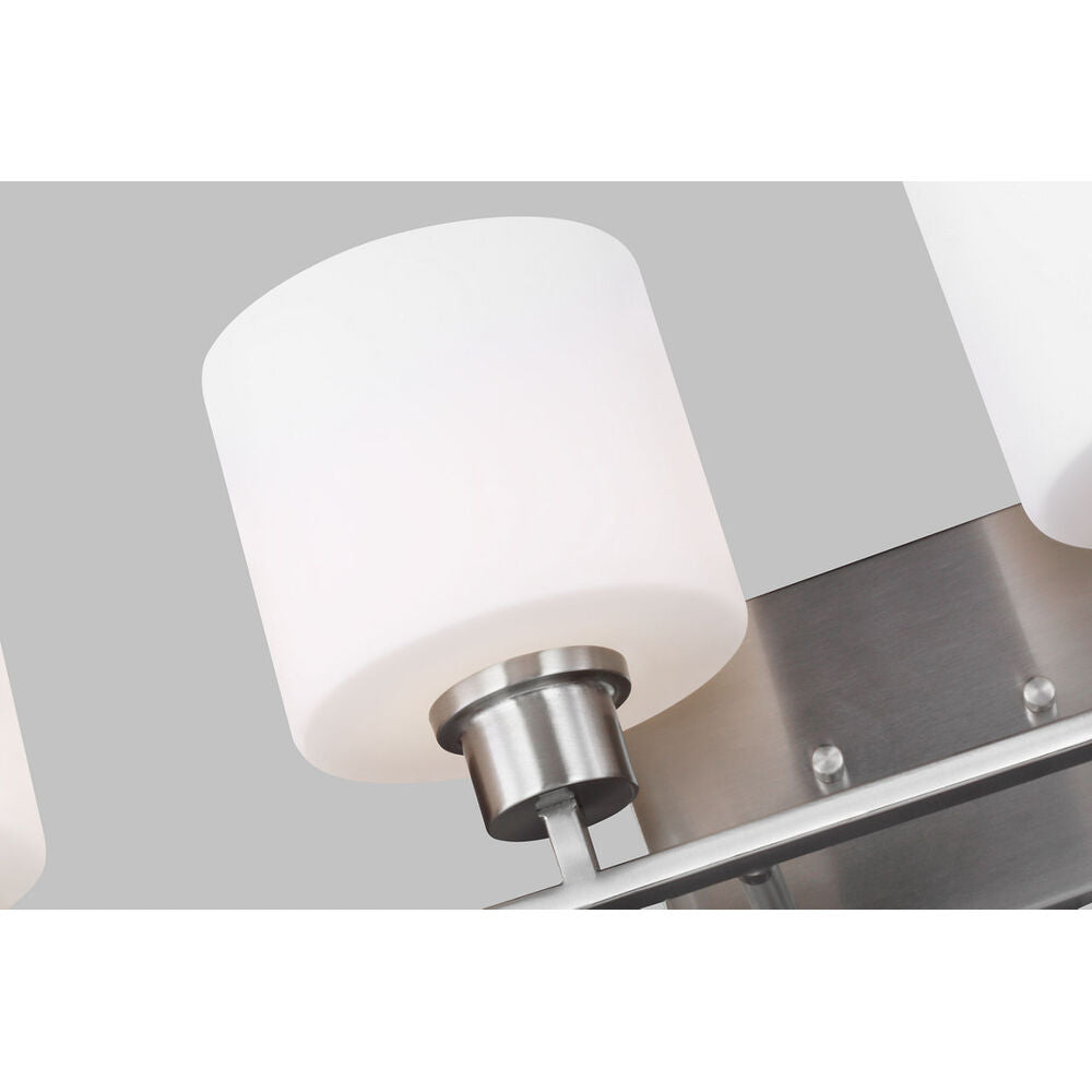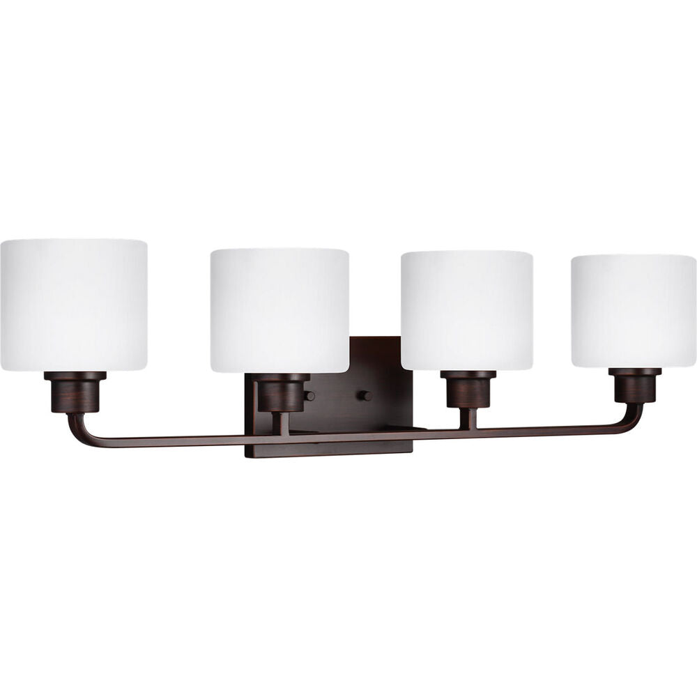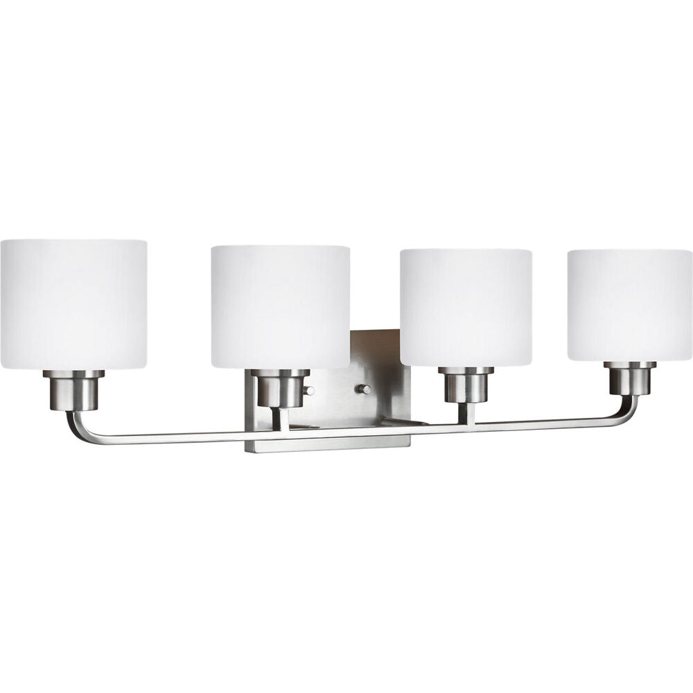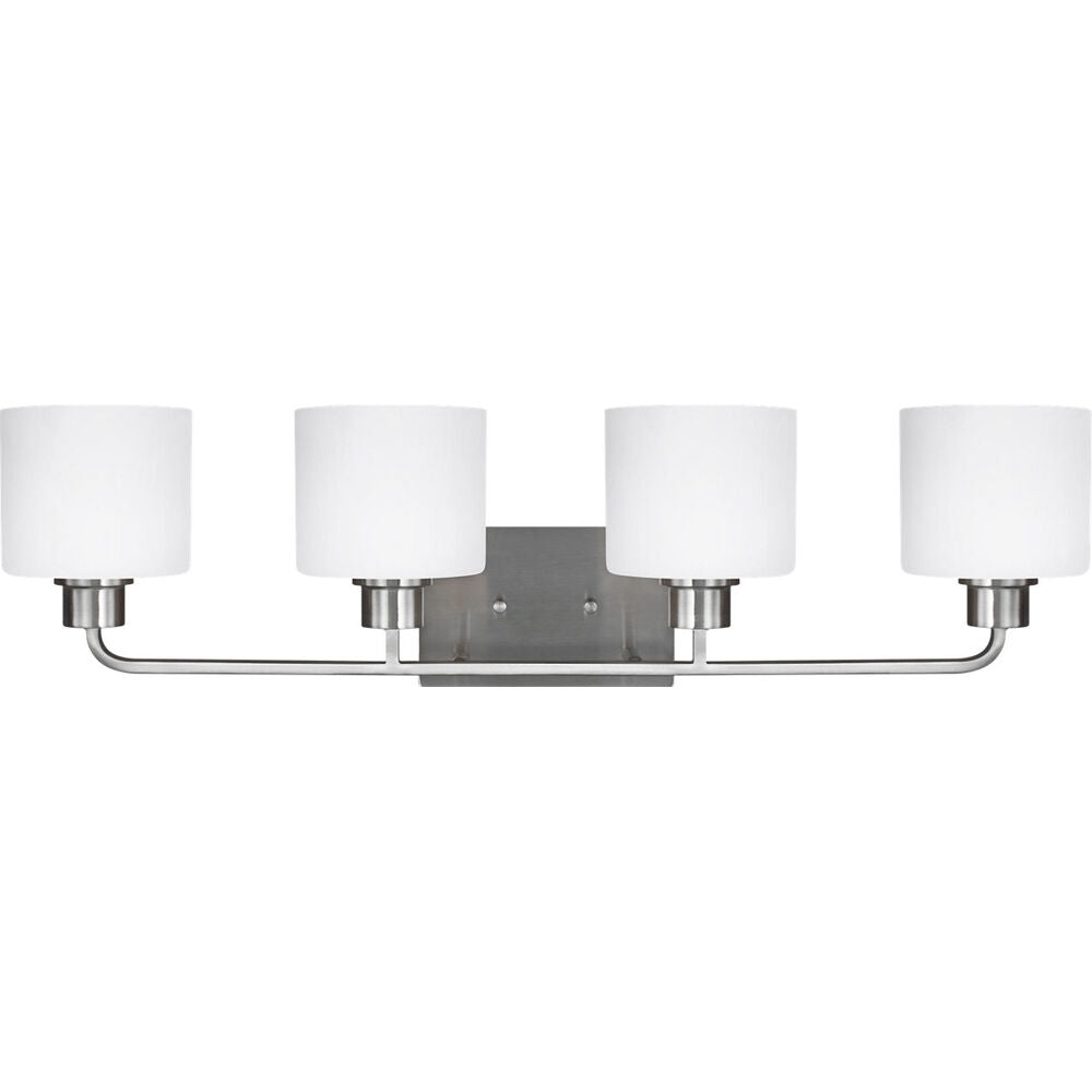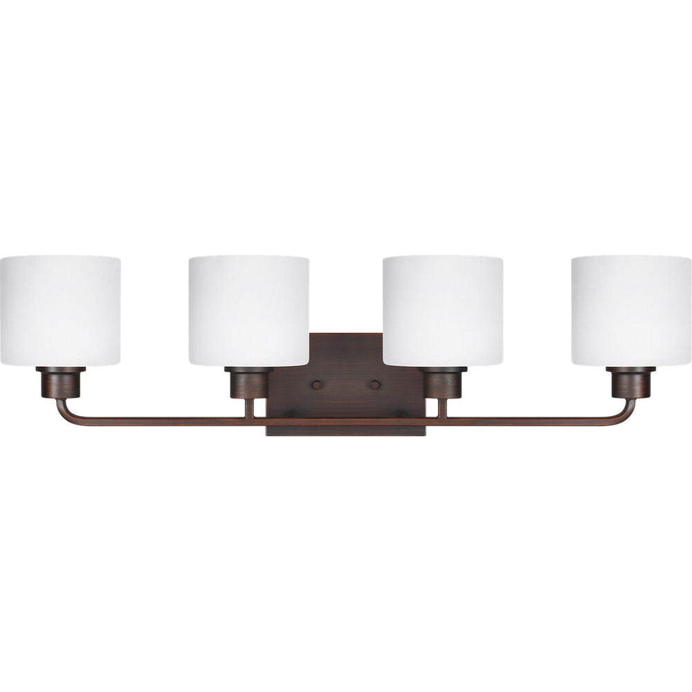 The Canfield four light vanity fixture provides abundant light for your bath vanity, while adding a layer of today's style to your interior design. Behind every seemingly simple design lies unerring attention to restraint and obsessive attention to the tiniest details. The Canfield collection by draws on the modernist traditions of "less is more". Essential functional elements dictate the aesthetics, and clean lines prevail. Layers of intricately finished hand-brushed steel progress vertically to the soft glow of light diffused through finely etched glass diffusors. Canfield offers a "whole home" lighting solution; offering lighting in every imaginable category from the auspicious 15 light 3-tier chandelier, to the concise mini-pendant and one-light sconces. The collection is available in hand brushed Burnt Sienna for a warm, tactile, almost Craftsman design style, or a brushed nickel to emphasize the more architectural elements of your interior.